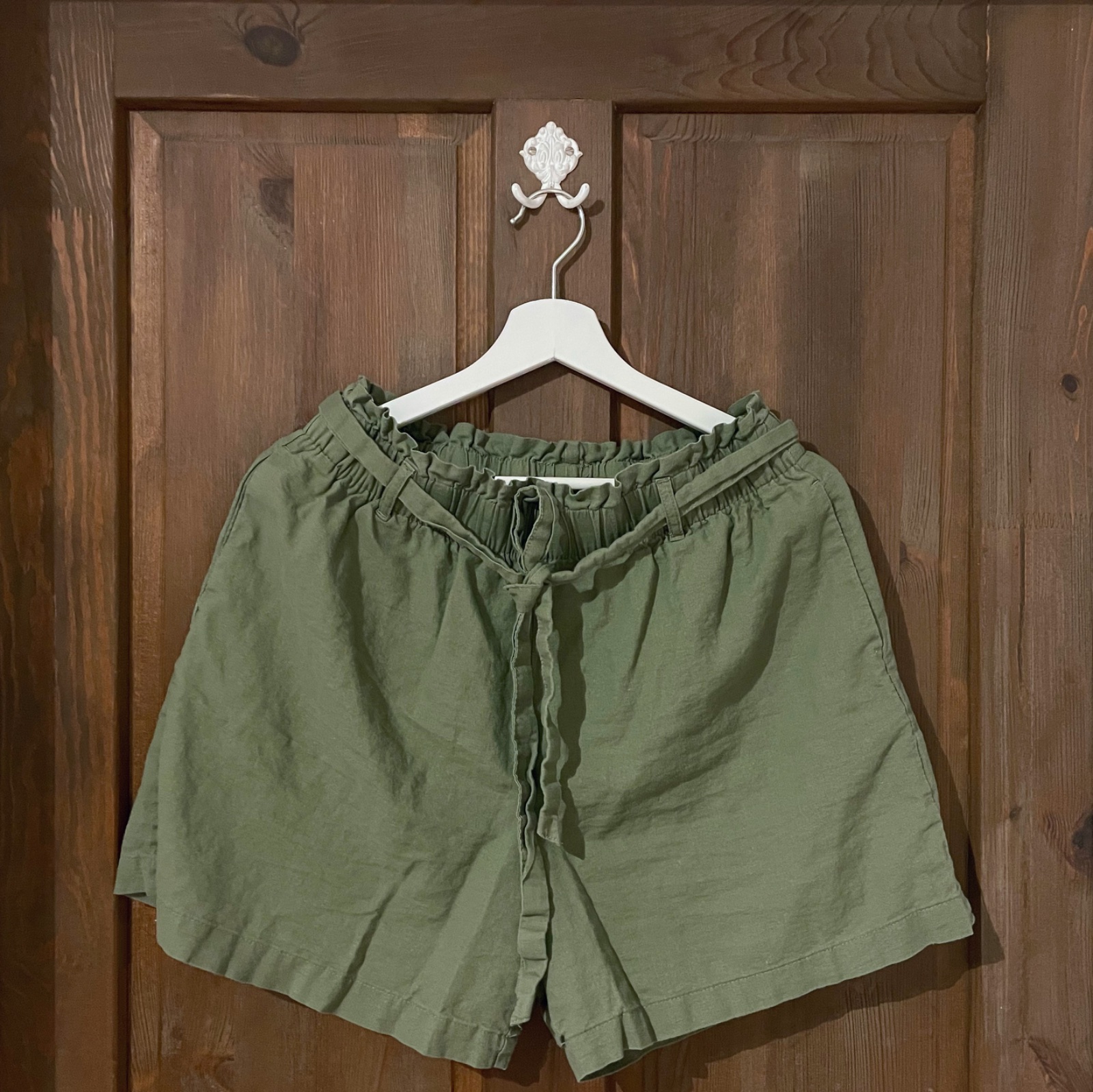 Ľanové šortky olivovej farby s bočnými vreckami