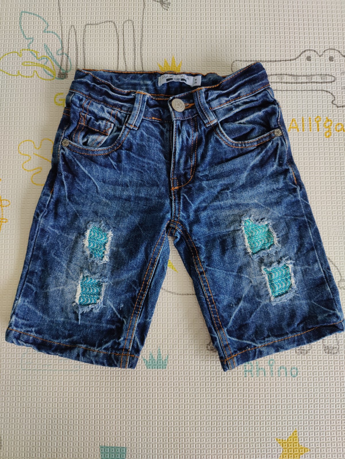 Predám chlapčenské tmavomodré rifľové šortky vhodné na 3-4 roky (veľkosť 98/104). Rozmery na fotkách. Šortky som ozdobila scrapmi zo šatky Loktu She Sea Motion Caribic. Pekný nosený stav.
