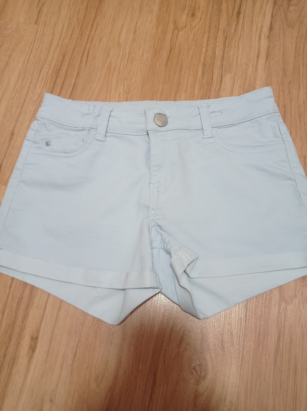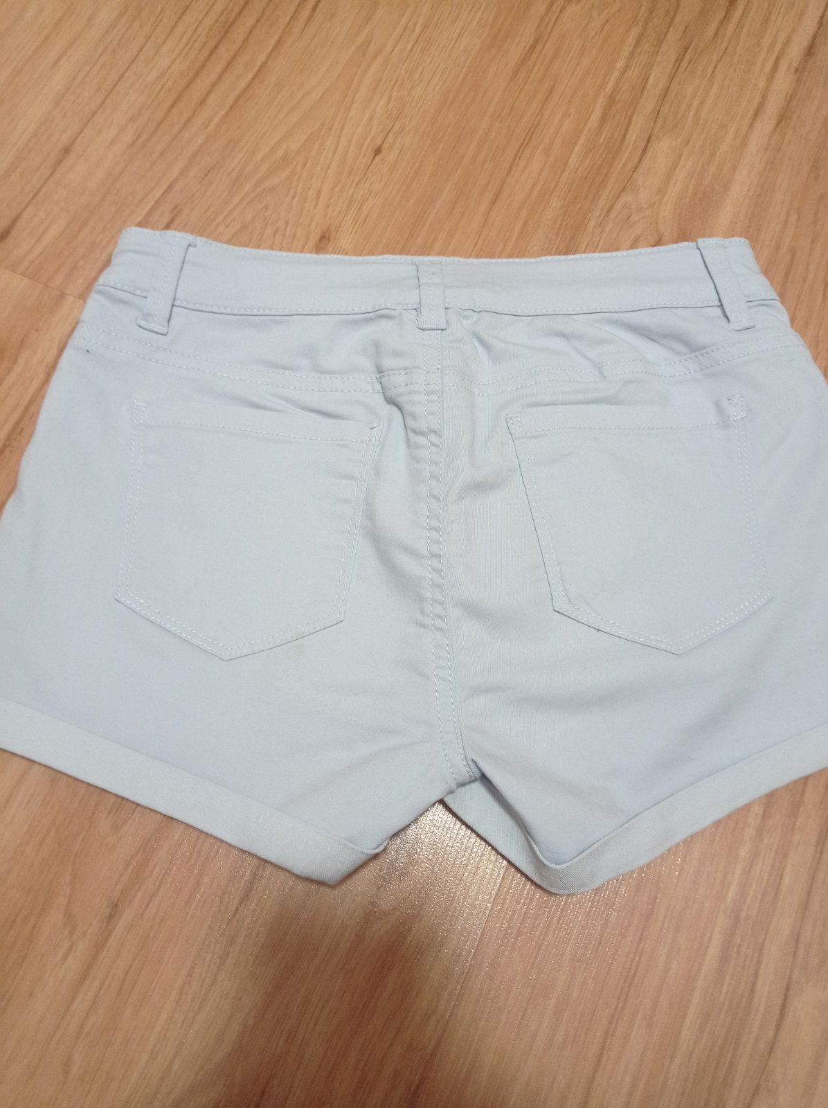 Bledomodre tenke riflove sortky s elastanom. Par x oblecene.pas na regulaciu. Dlzka:24,5 vpredu. 33,5 cm pas v nenatiahnutom stave. Da sa aj zmensit.