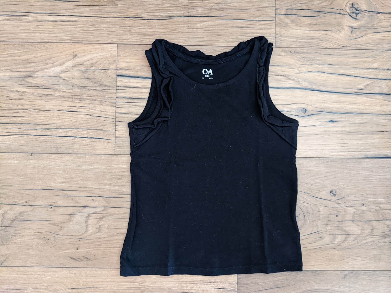 Pridám k nim letné tieločko, na rukáve jemný volánik, je veľ.128 ale sedí aj na 134, je elastické, nosili sme spolu, bez poškodení.