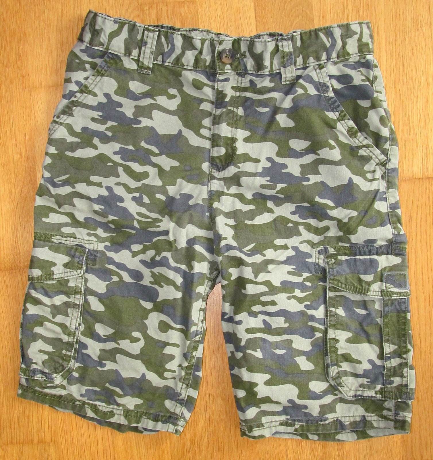 Bermudy z pevneho platna so 6 vreckami, zadne vrecka a vrecka s klopu maju suche zipsy, v pase je nasatvitelna guma. Stav vyborny, malo nosene. Pas max. 2*38 cm, da sa stiahnut, dlzka na boku cca 48 cm. Nie su s elastanom, len bavlna.