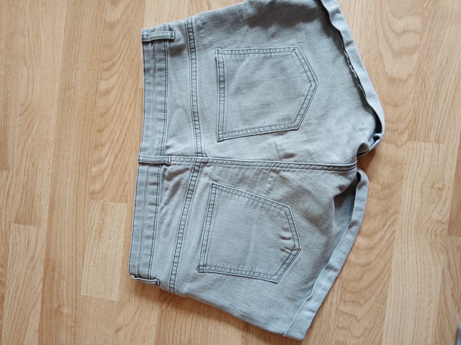 Predam krasne stylove a netypicky sa zapinajuce kratasky, vzadu je maslicka sedia na velkost S su znacky cropp bledo sivej farby so zltou top stav, kosela k nim gratis cena 7€