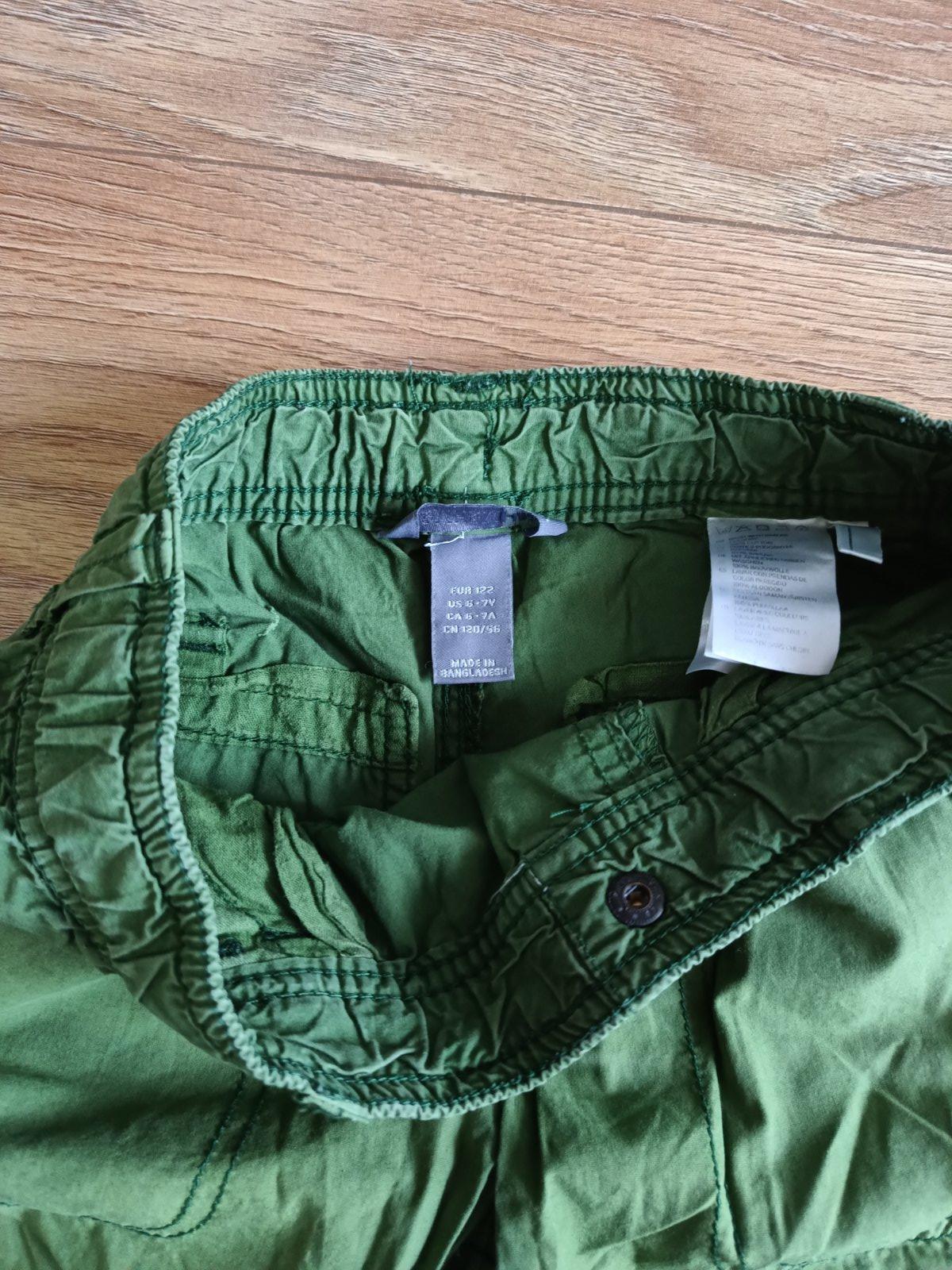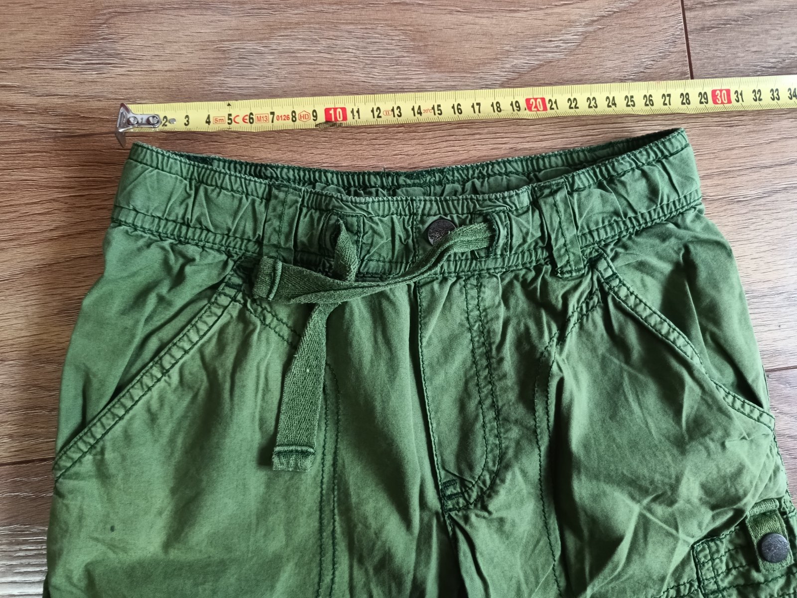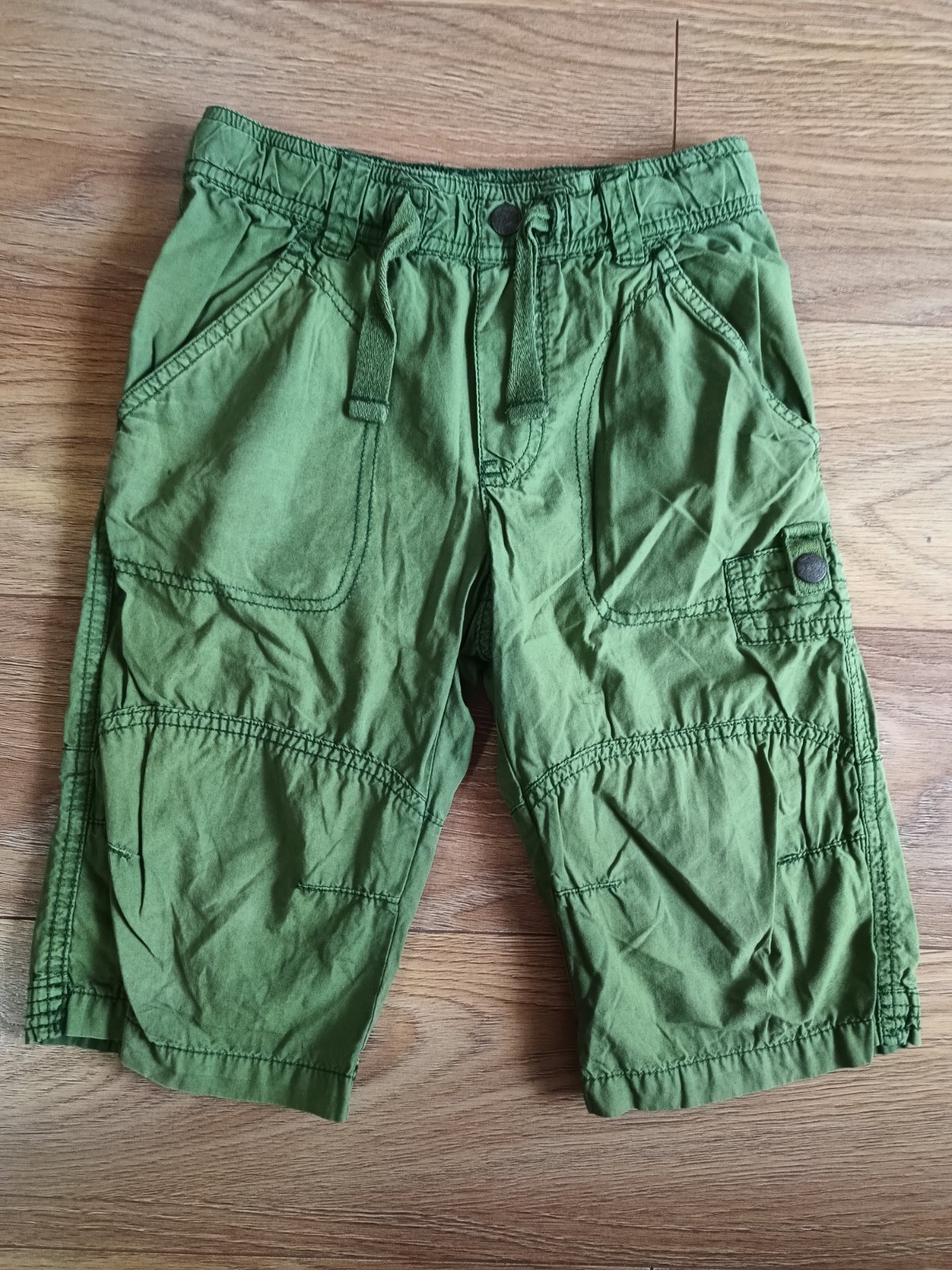 Bavlnené tenké kraťasy 3/4 značky HM, s regulovaným pásom. Vrecká vpredu, vzadu na stehne so zipsom. Nosené do školy. V peknom stave, od kolien dole jemne bledšia farba, zrejme požívaním, látka nie...