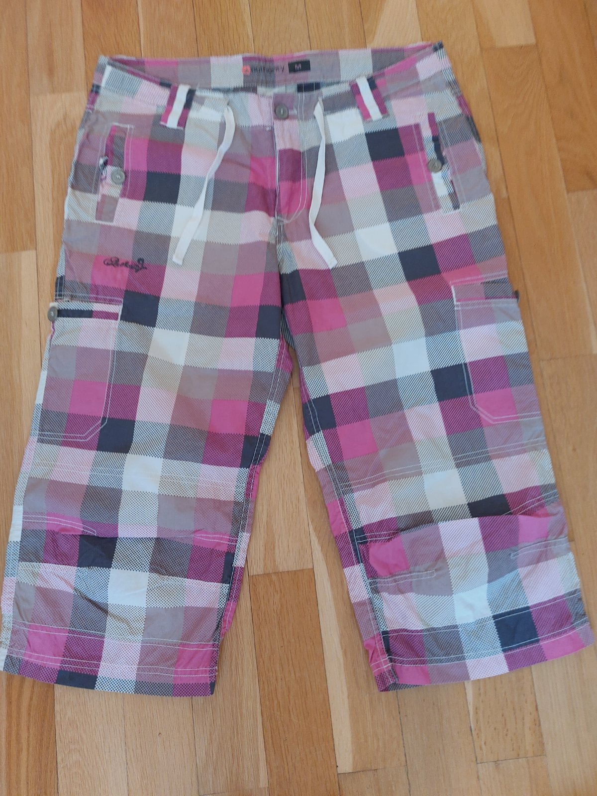 Tmavozelené športové tenšie trojštvrťové nohavice vo veľmi dobrom stave, iba vzadu jeden malý fliačik, množstvo vreciek, rozmery a zloženie na foto