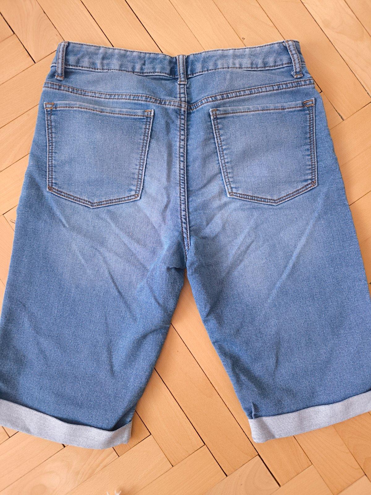 v peknom stave bez poškodení, veľkosť na 14rokov, v páse gumičky na stiahnutie, dĺžka 29,5cm, pás v kľude34,5cm, predný sed 24,5cm, zadný sed 27,5cm.