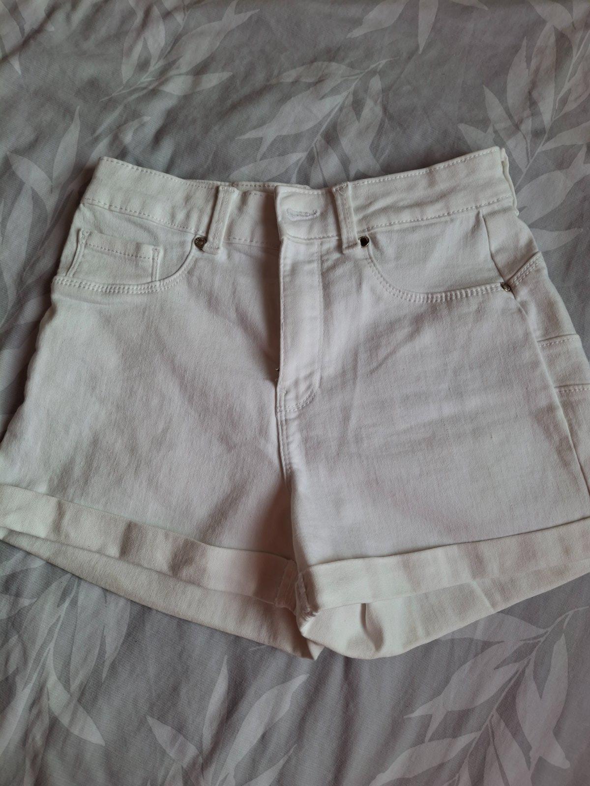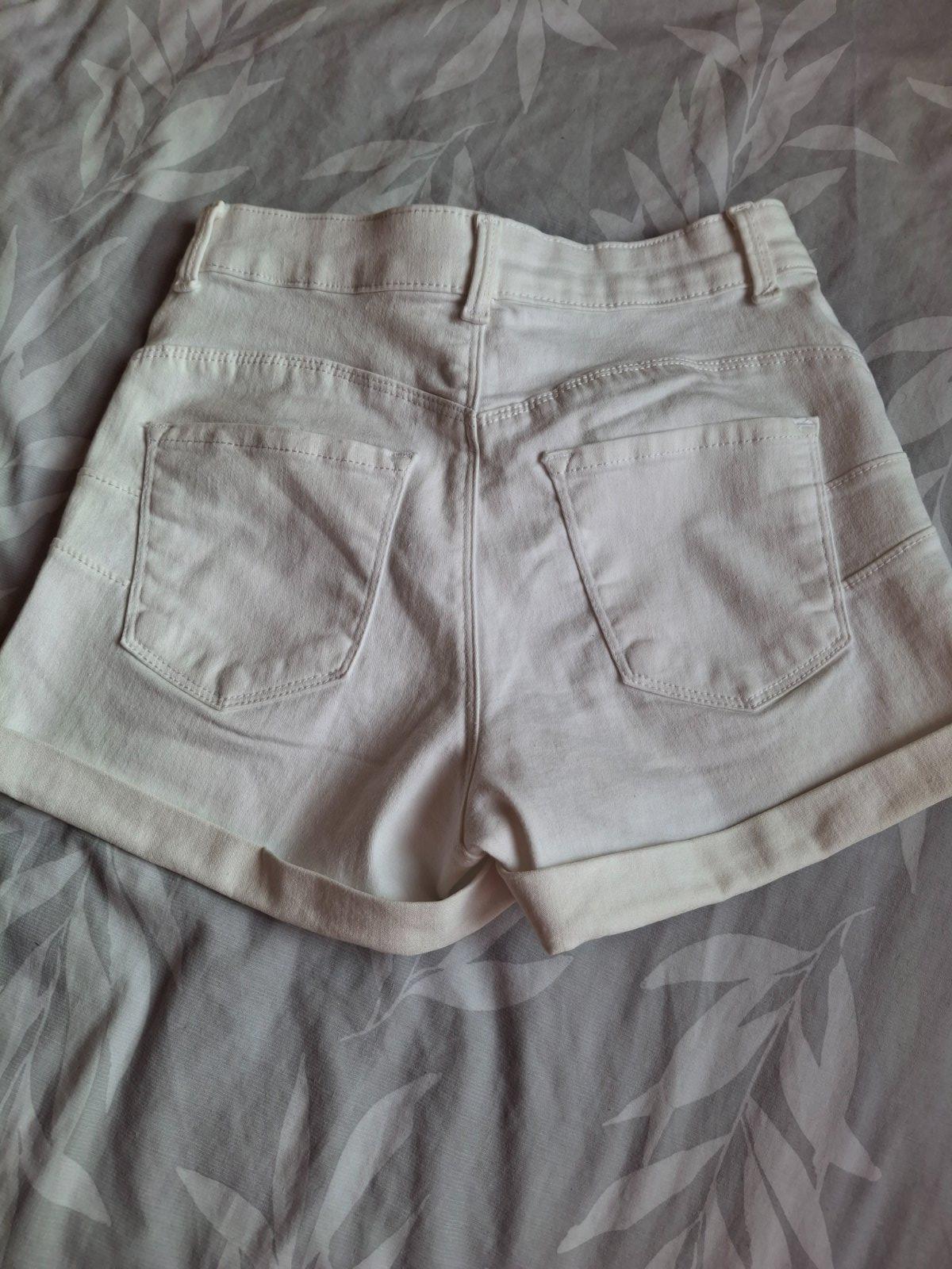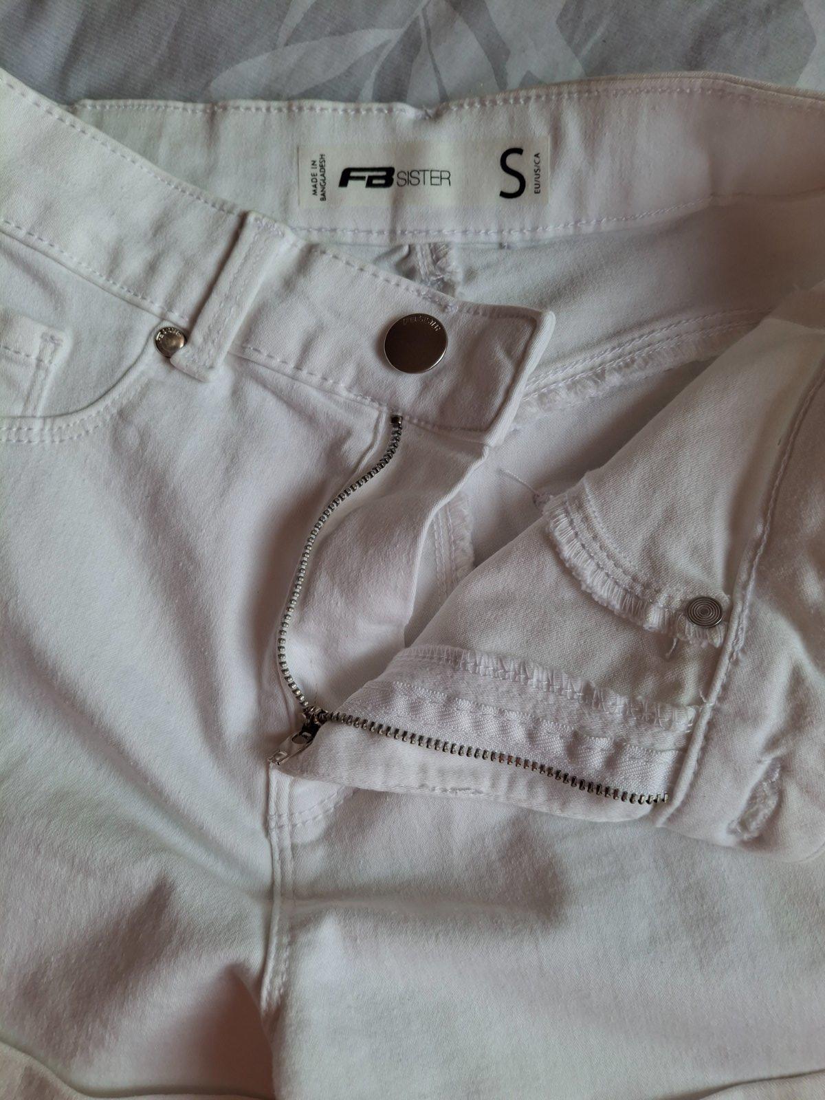 Nenosené, len odstrihnute visačky, pružné, mäkká riflovna. Pekne biele, fotene v pritmi, farba na foto skreslena. Sadnu na XS - S. Cena 5 + posta