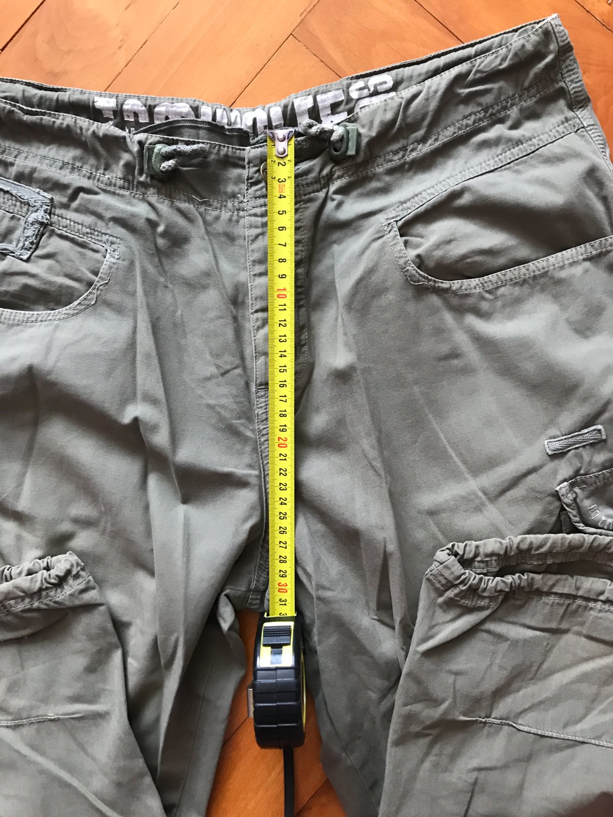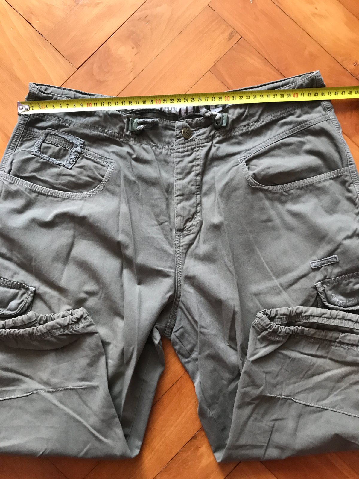 zapínanie na zips a gombík, doplnené šnúrkou v páse na úpravu šírky pásu (nastaviteľné)