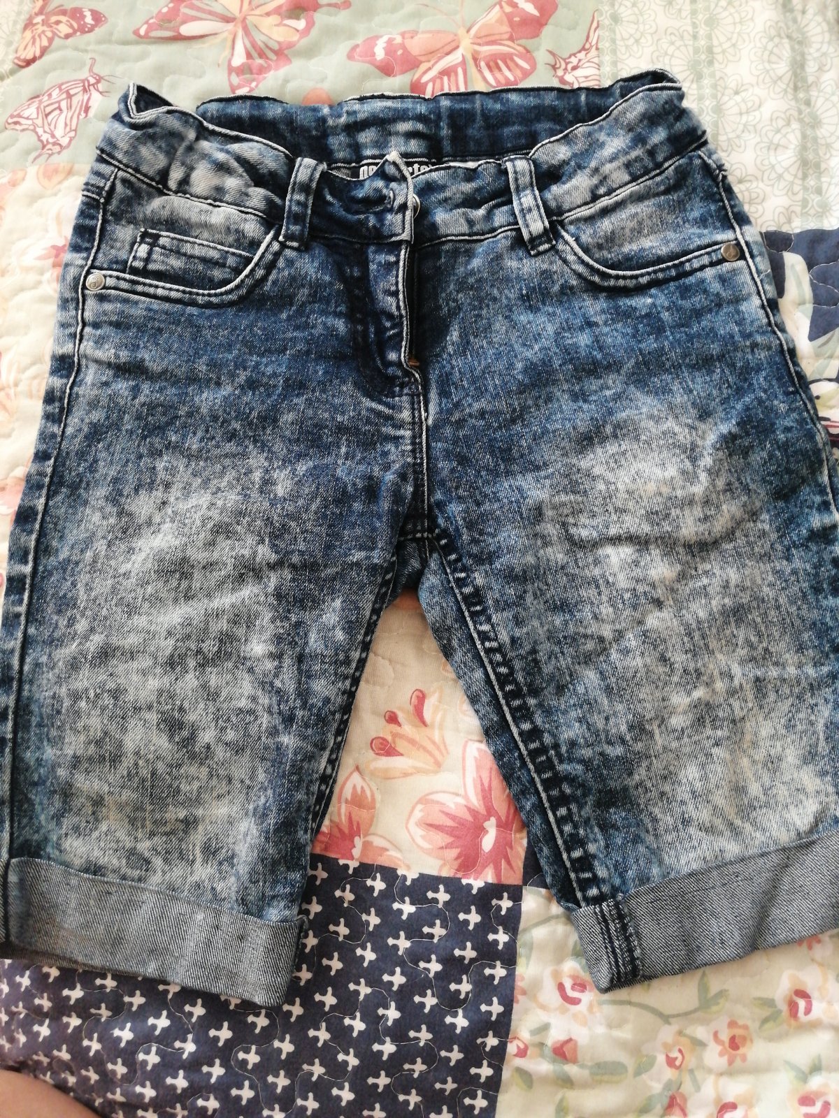 Predám dievčenské rifľové šortky s výšivkou na pravom boku, používané, bez vád. Možnosť prispôsobenia v páse, vrecká funkčné, zapínanie klasické na kovový gombík, lem na nohách zámerne roztrapkaný,...