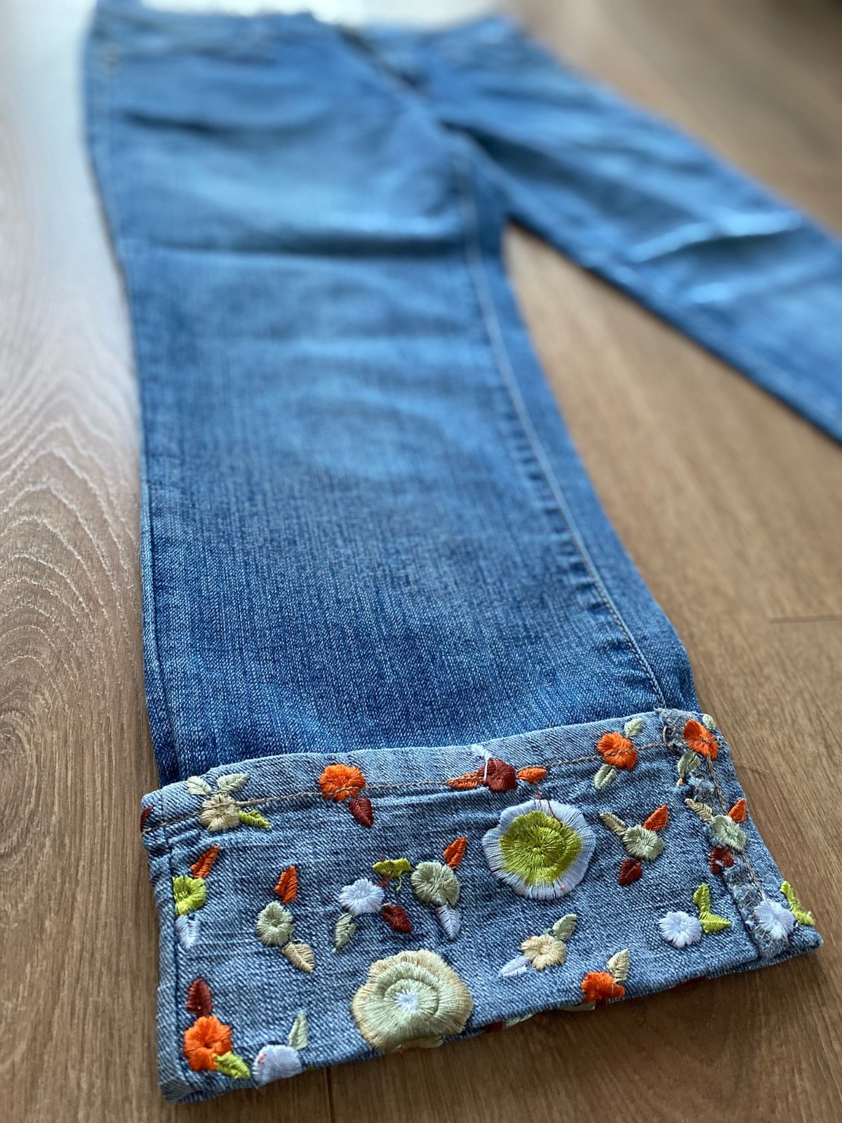 nosené trojštvrťové rifle v dobrom stave bez poškodenia. Spodná časť nohavíc je zdobená výšivkou.