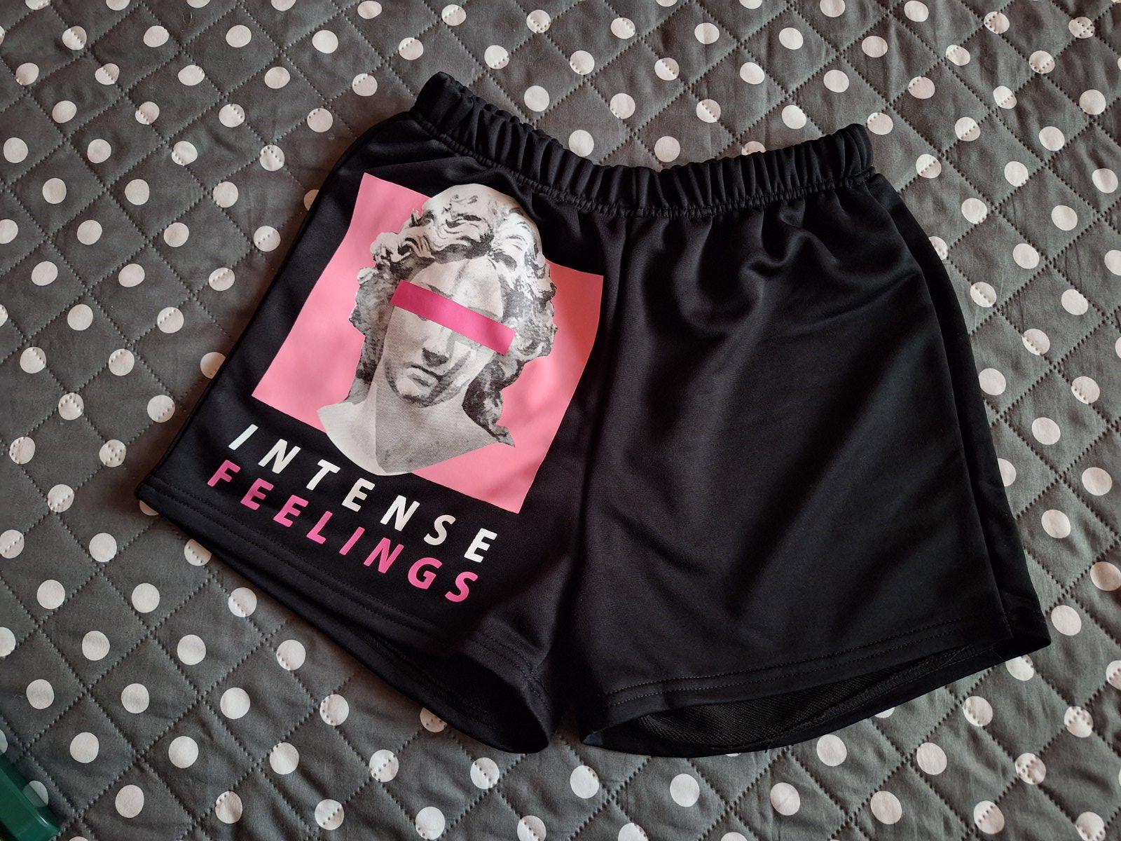 Krásne elastické kratasy, nenosené miery su klude 34cm v pase, ale su na gumu, dlzka 38,5 cm, sirka spodneho otvoru nohavice 25,5cm, po natiahnuti v pase na doraz majú 46cm