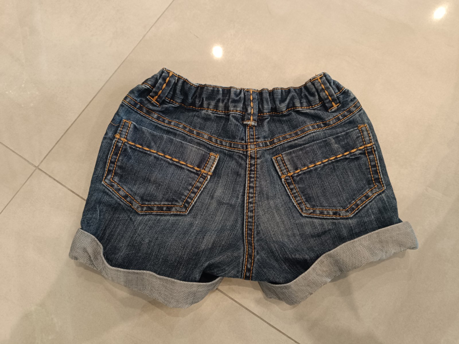Tmavomodré riflové kraťasky, v páse na posúvanie. Rozmery: šírka max. 2x28cm, dĺžka 28cm, hĺbka sedu 11cm, šírka v stehne 2x19cm. Cena je bez poštovného.