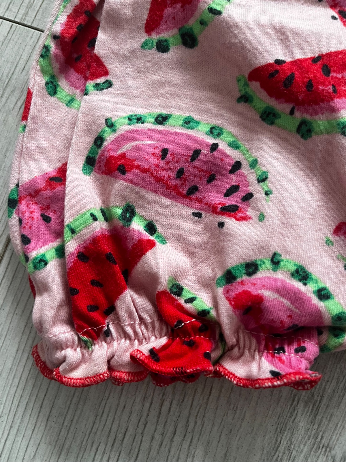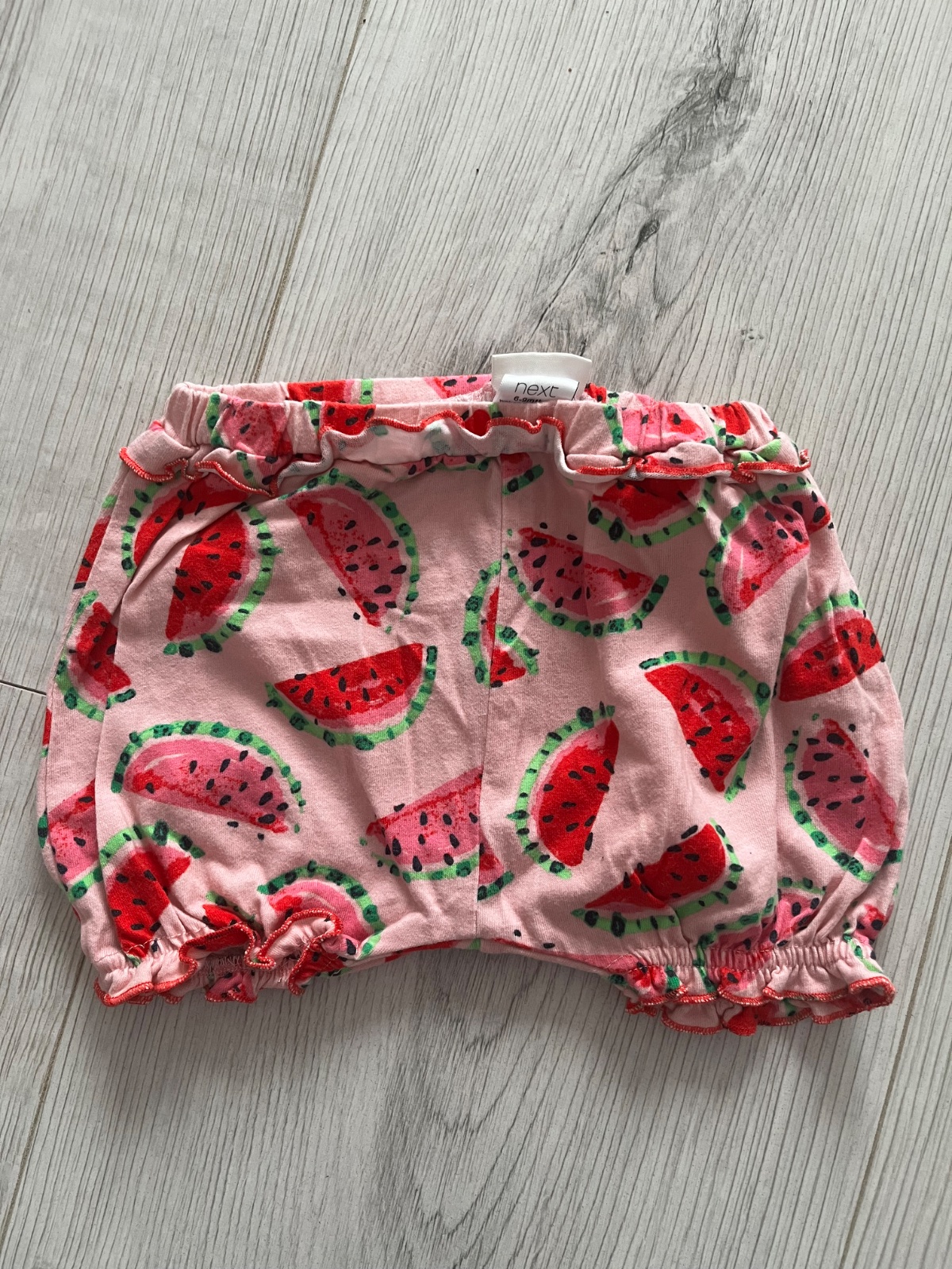 Predám ružové krátke nohavice s motívom melónikov s ozdobnými volanmi. Značka: Next, veľkosť: 74 (6-9 mesiacov).