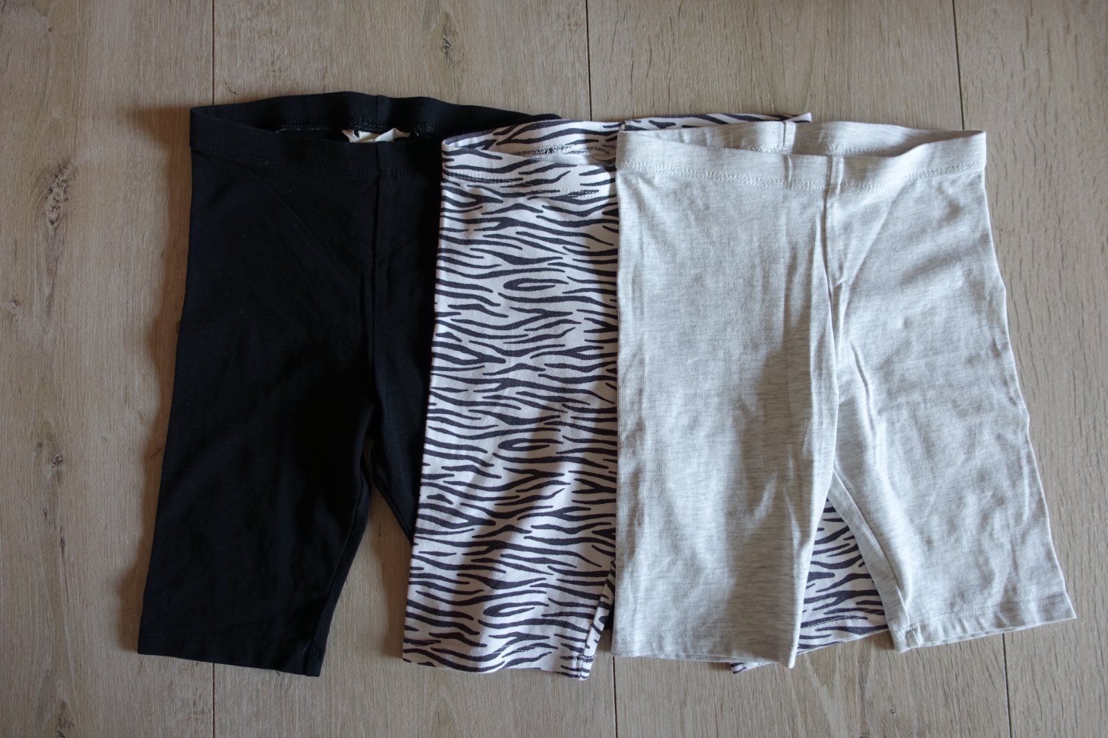 Predám 3 krásne kraťasky vo farbe svetlo šedá, čierna a čierno biela. Čierne boli iba opraté, svetlo šedé sme mali max 2-3x a čierno biele boli nosené viac, trošička sa mi zdá, že farba pásikov je svetlejšia, už nie sú také sýte ako za nova, ale ponosiť sa určite ešte dajú. Nie sú ani deravé, ani žmolkavé. Dĺžka svetlo šedých je 34 cm a šírka pásu v kľude je 24,5 cm. Dĺžka čiernych je 35,5 cm a šírka pásu v kľude je 24 cm. Dĺžka čierno bielych je 34 cm a šírka pásu v kľuje je 24,5 cm. Predávam iba spolu, takto boli spolu aj kupované. (G)