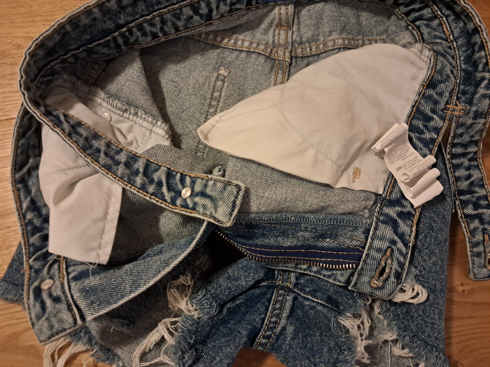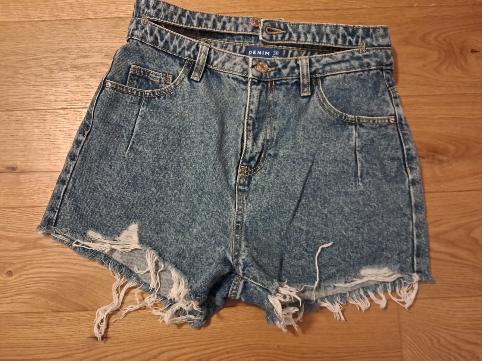 predám dámske riflové kraťasy v dobrom nosenom stave, píšu veľkosť 38, značka Denim, 100% bavlna, zapínanie na zips a gombík, dve predné a dve zadné vrecká, dierovanie dľžka 33 cm pás 39 x 2 cm bok...