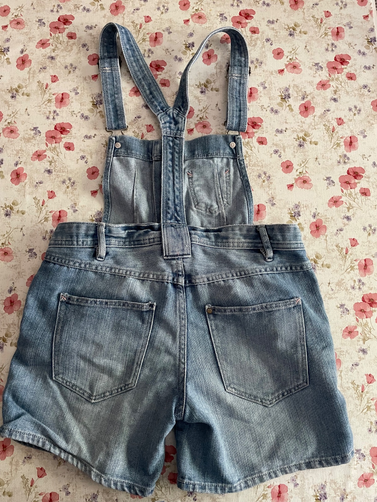 dievčenské modré riflové šortky na traky, vrecká vpredu a vzadu, dole ozdobené vzorom, príjemný kvalitný materiál, zloženie: 83 % bavlna, 17 % viscoza, stav: výborný, málo nosený, značka: Denim, ...