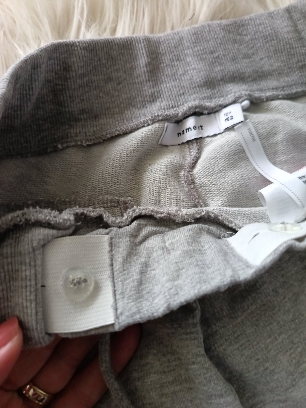 Nosené, bez poškodenia. Bavlnené, pohodlné. Kvalitné. V páse sťahovacia gumicka s gombíkom.