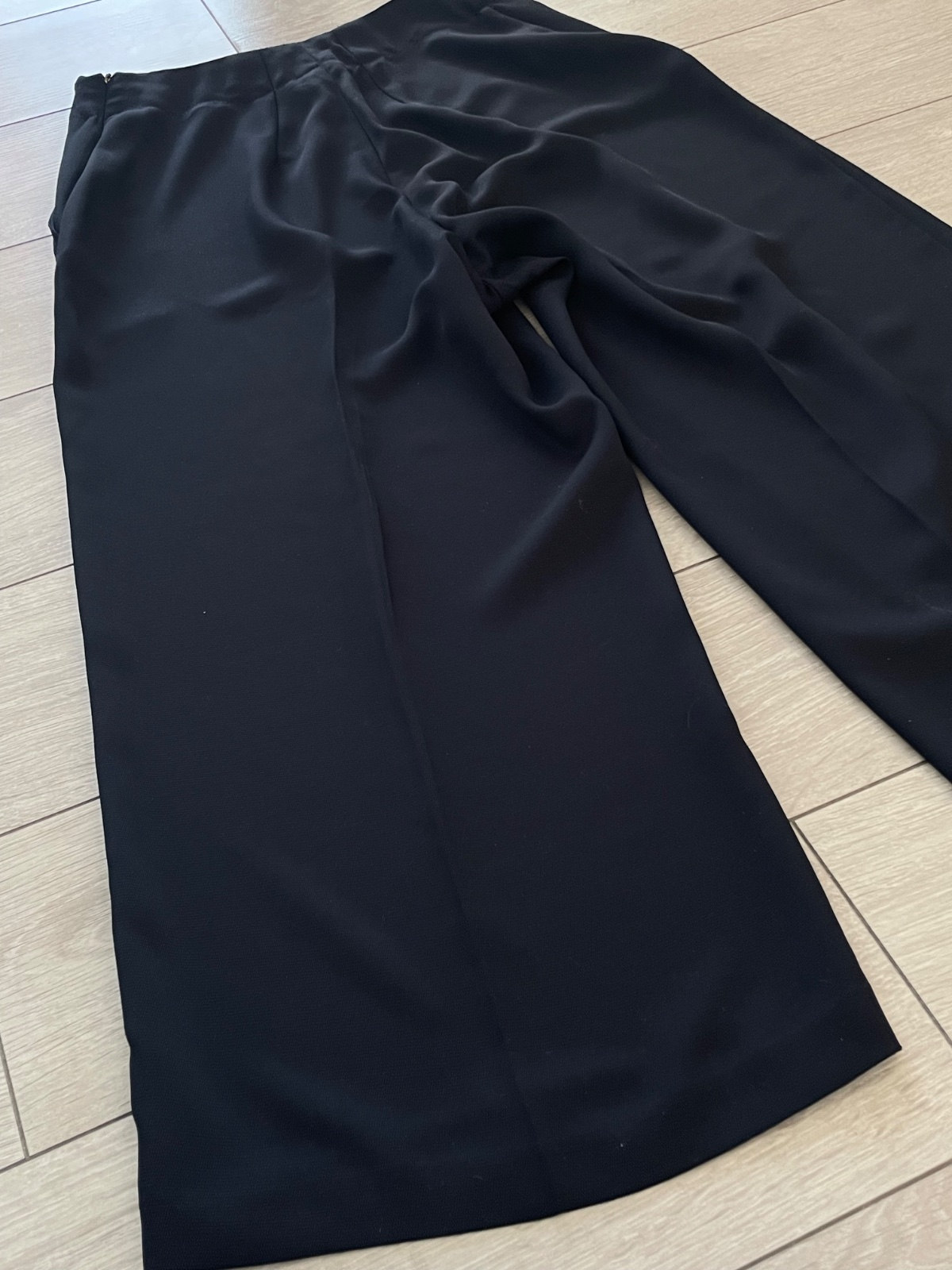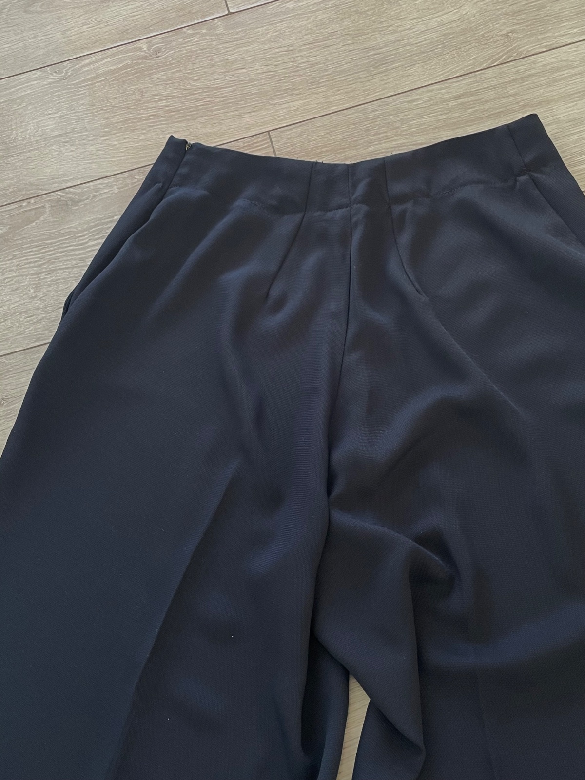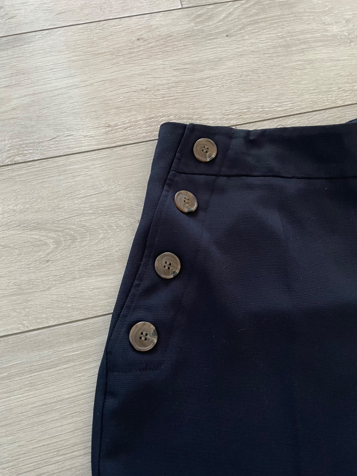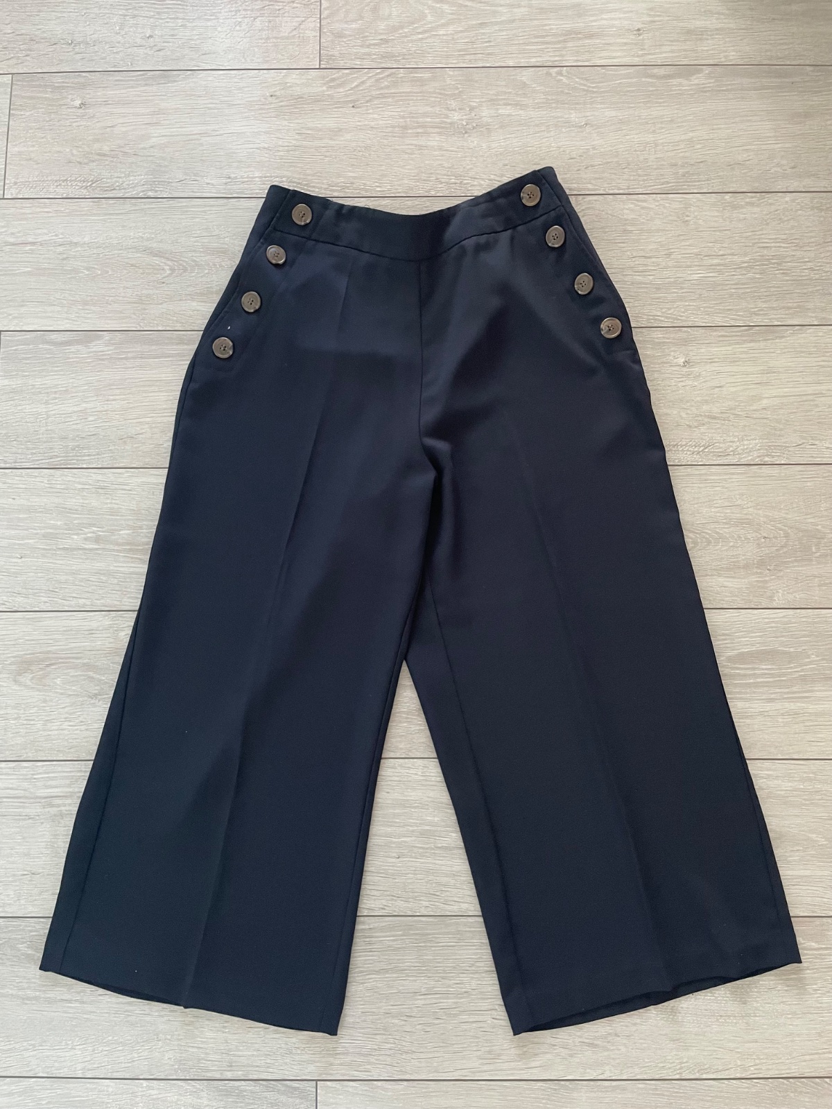 Široké trojštvrťové tmavomodré nohavice s gombíky po stranách.
