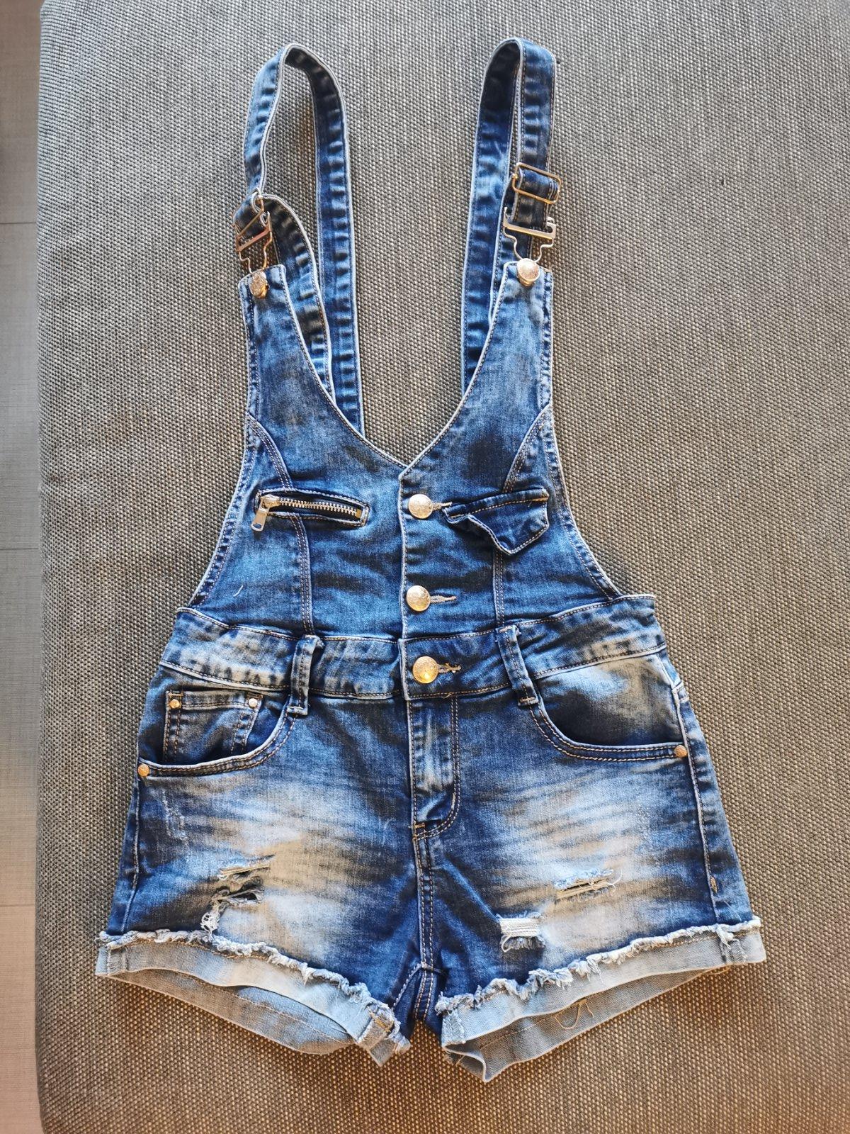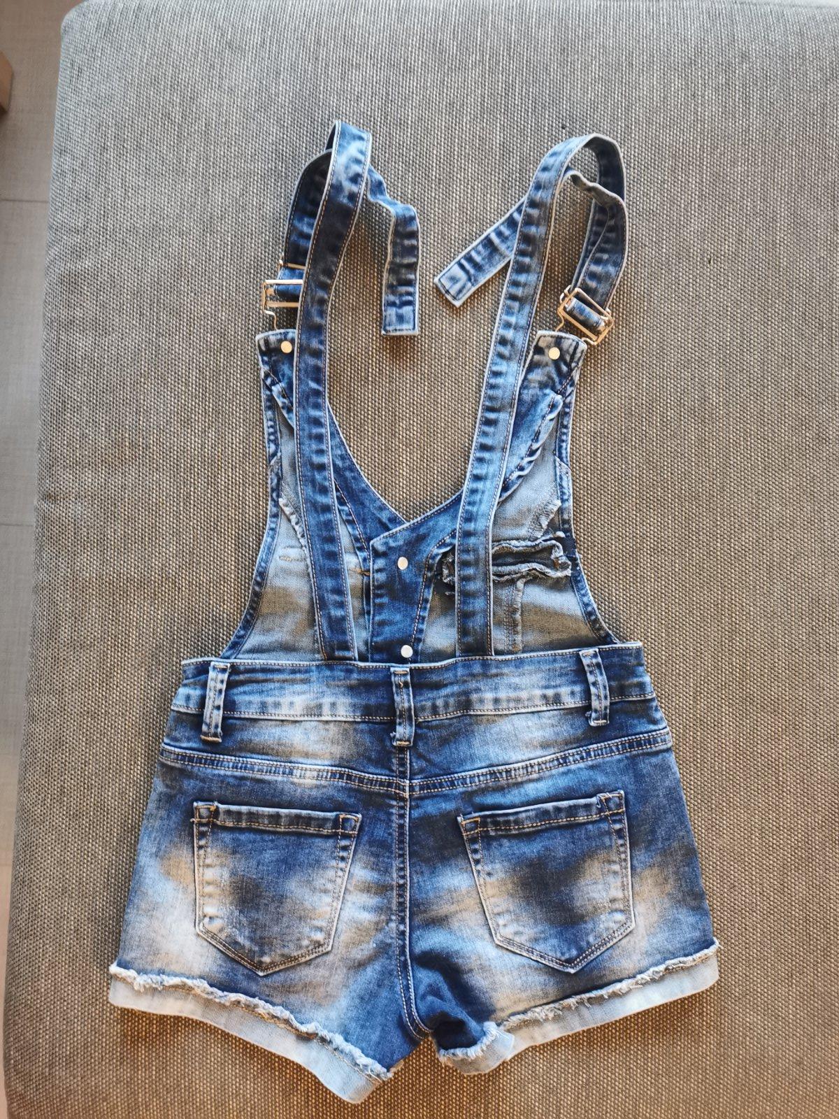 Štýlové kraťasy na traky z poddajnej rifloviny, veľmi dobrý stav. Šírka v páse je 2x35cm.
