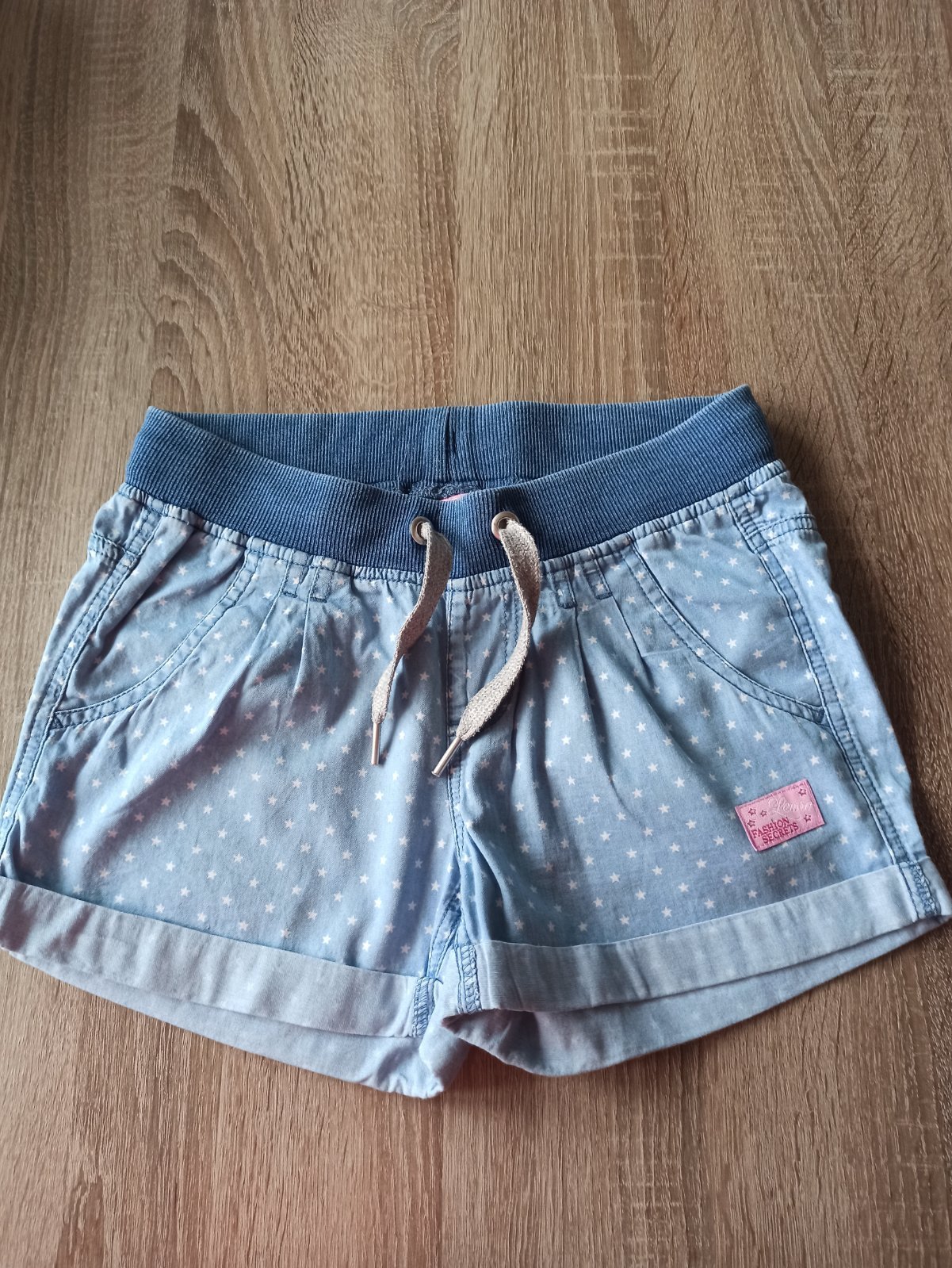 Kraťasy č.140/146 bledomodré, celková dĺžka 26cm, pás na gumu meraný v kľude 2x31cm, funkčne šnúrky. Bez poškodenia.