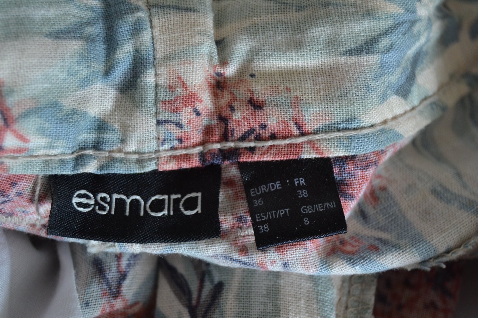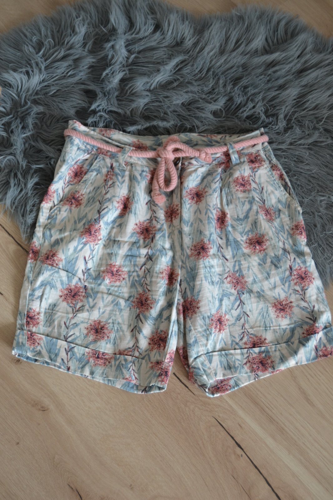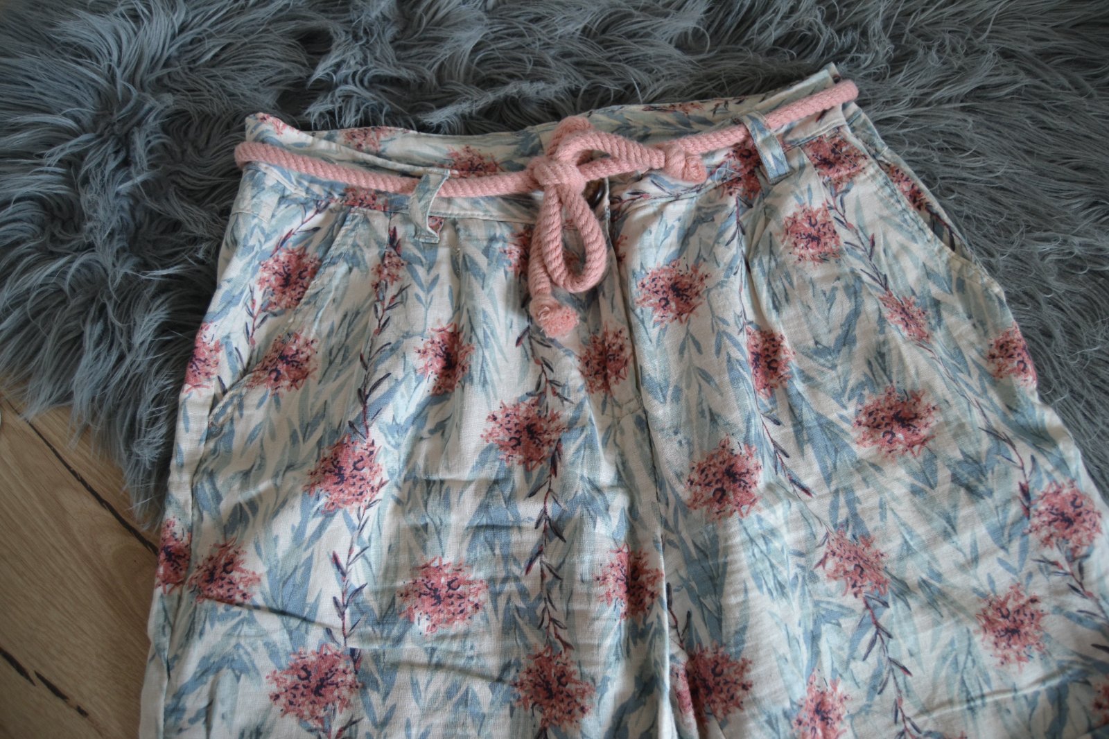 Dámske krátke elegantné nohavice s kvetinkami, ružový opasok cez pás, veľkosť 38, zn. Esmara.