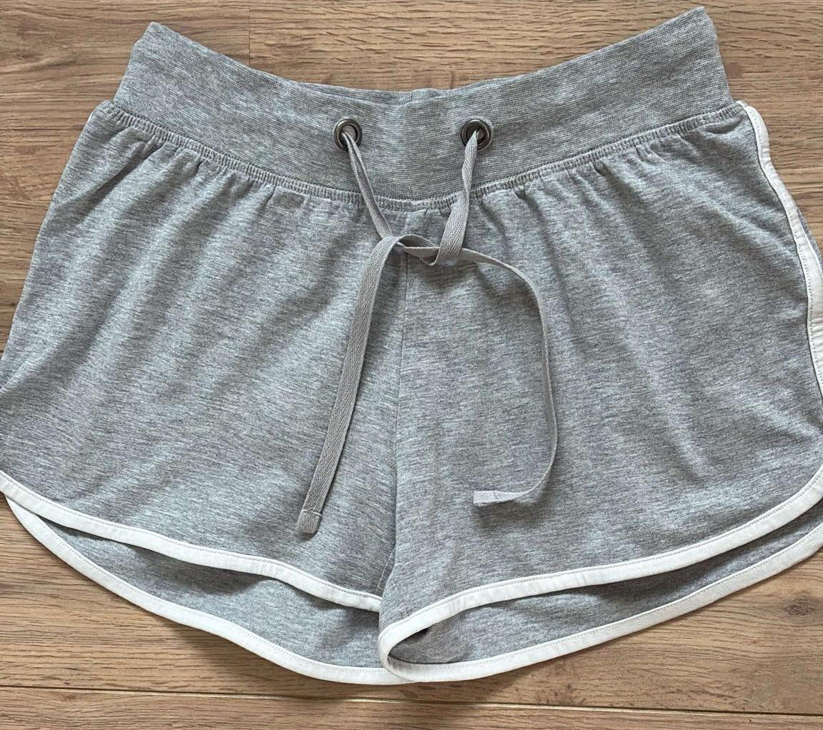 Predám pohodlné sivé šortky, s bielym lemovaním, z mäkkého úpletu, pekne drží tvar, majú širokú 4,5cm gumu a šnúrku na stiahnutie, 2 bočné funkčné vrecká, d=25cm, š pás=32cm, veĺmi dobrý stav.