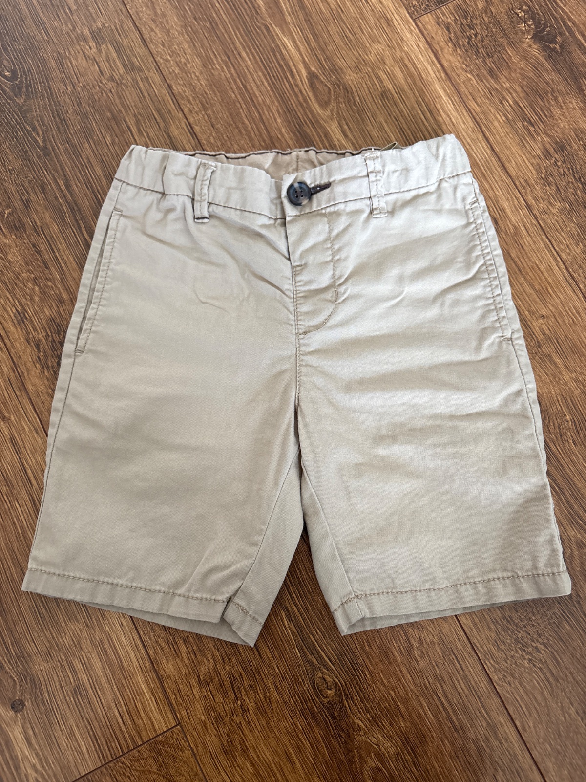Letné kraťasy krémovej farby, veľkosť 110. Celková dĺžka meraná na boku 41 cm, dlzka od rozkroku 24 cm, sirka od rozkroku 23 cm, pas v klude 26 cm. Kratasy su na gumu v pase s moznostou stahovat sn...