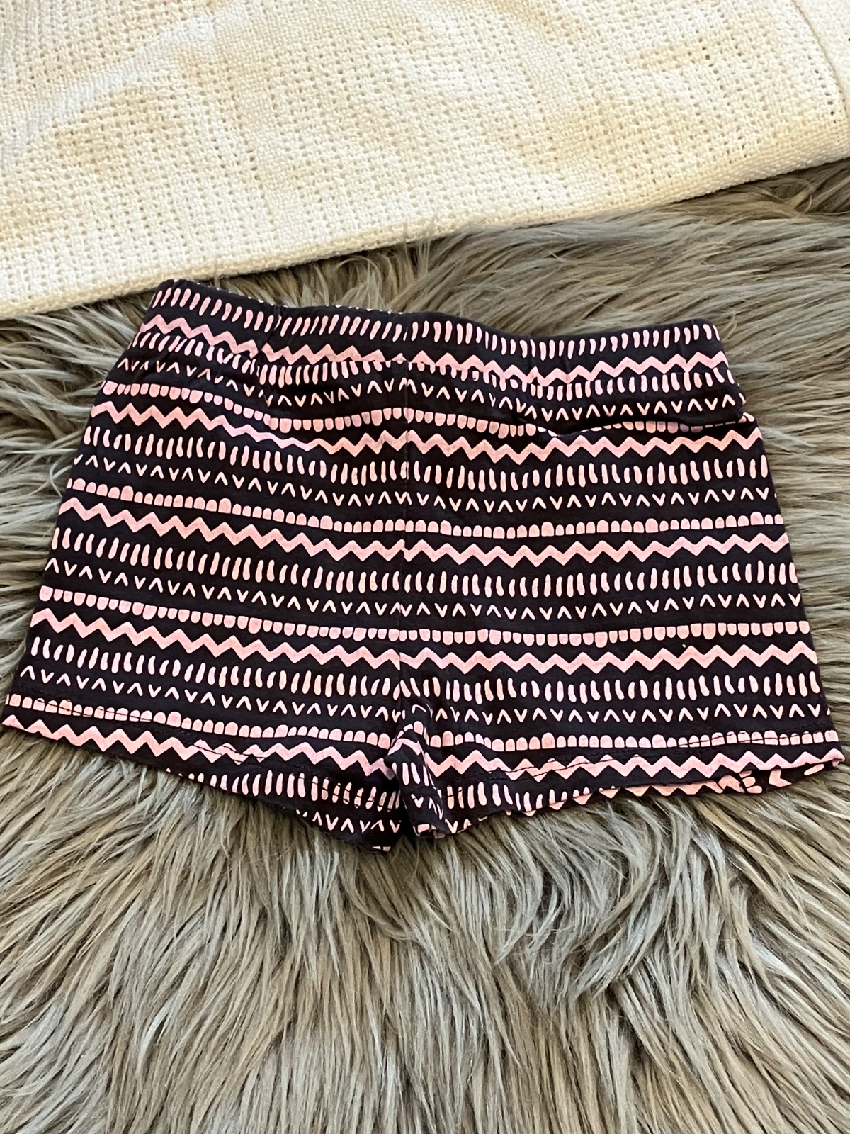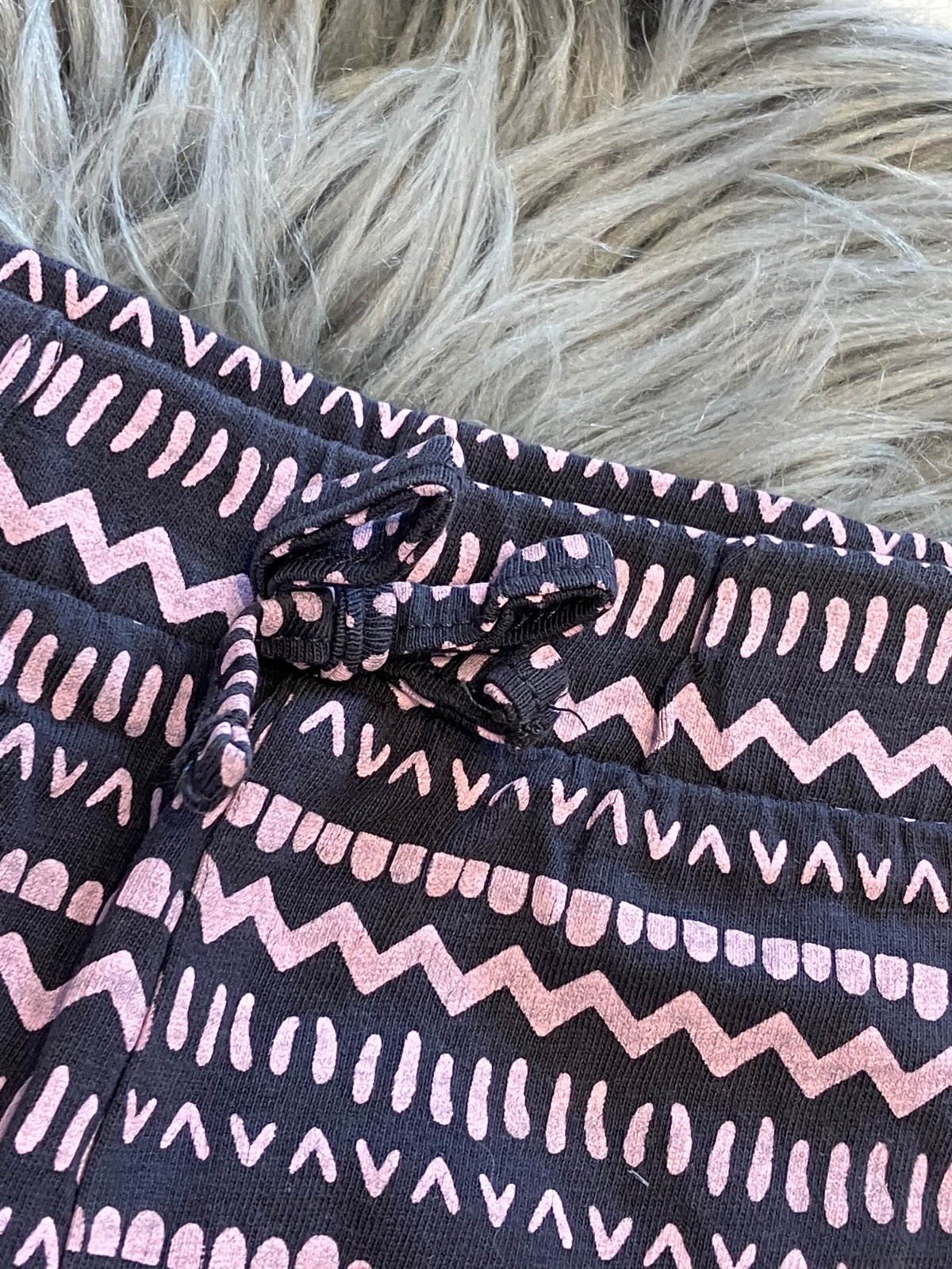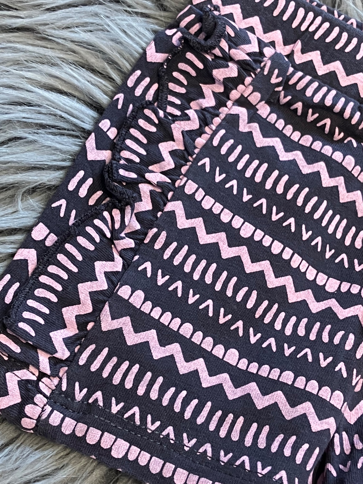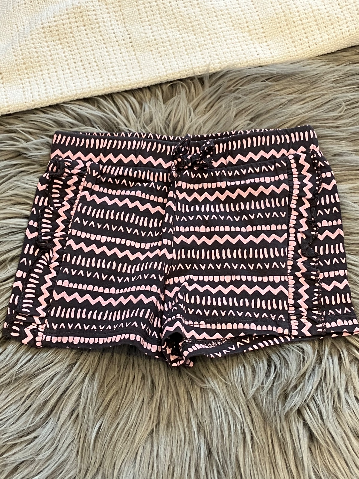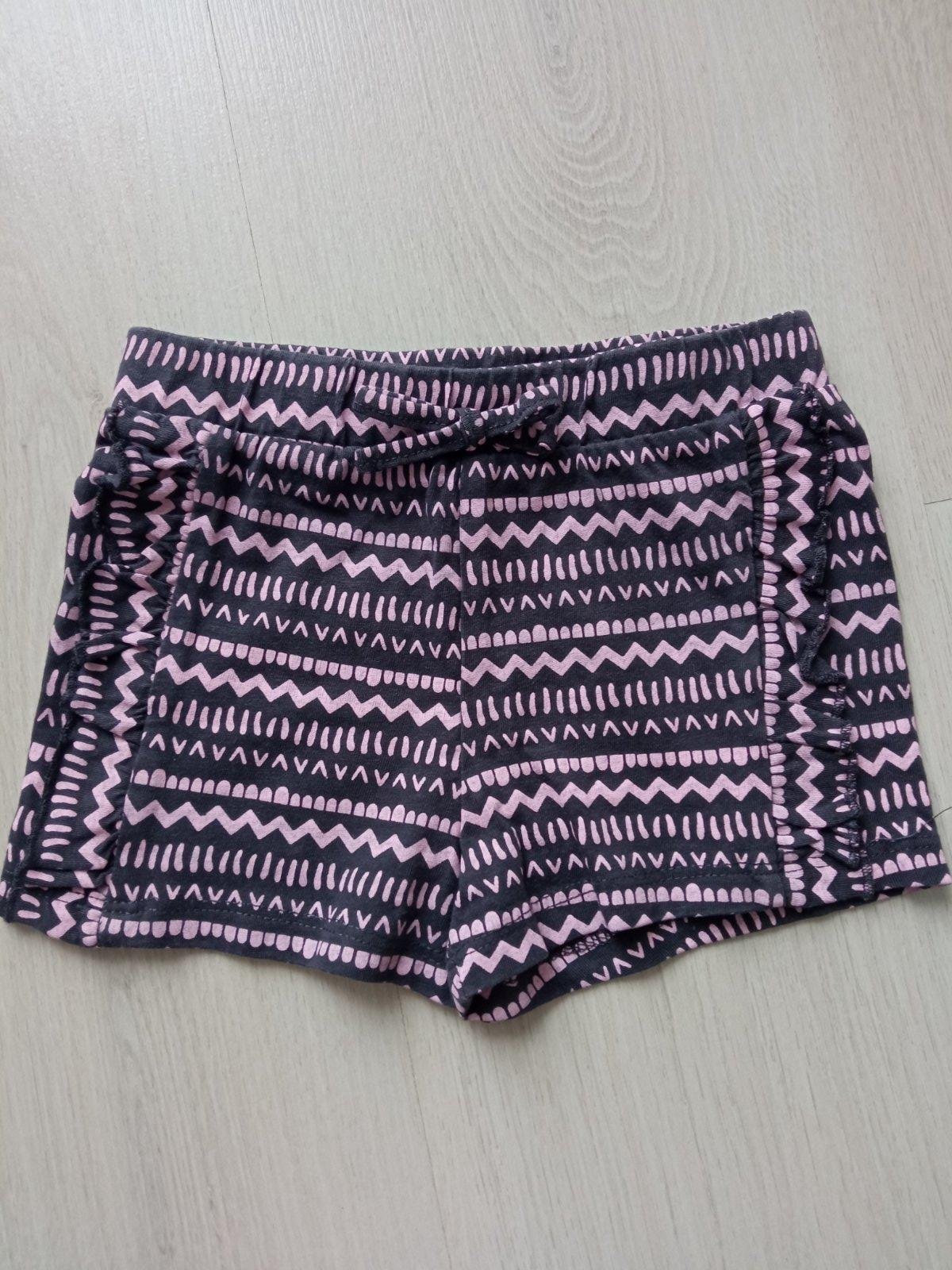 Dievčenské šortky vzorované s fodričkami, elastické, pás na gumu, teplákovina, farba tmavosivo - svetloružová, materiál 100%bavlna.