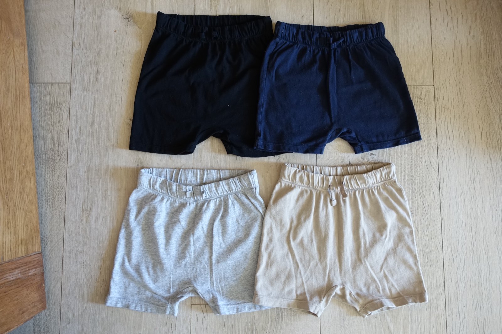 Predám 4 ks kraťasky z jedného balu. Čierne sme mali 1x, tie sú top stav. Tmavo modré sme mali len pár krát, béžové 2x, ale hneď po prvom opratí sa na nich urobil trolinka chĺpoček z prania pri naklonení a šedé boli tiež pár krát nosené, ale žiaľ tie sú vhodné už len po byte, malý mi s nimi sadol do pieskoviska, bol mokrejší piesok a ostal mu na nich kruh. Nezišlo mi to úplne, pri naklonení ho tam stále vidím. Nie je výrazný, vidno ho len pri naklonení. Žiaľ. Nepoužila som na to nič agresívne, možno to niečim ešte pôjde vyprať. Nepodarilo sa mi to tak dobre odfotiť. Ale kraťasky sa určite všetky dajú ešte ponosiť. Nemajú vrecká, šnúrka sa dá plne zatiahnuť. Sú ľahučké, tenučké, mäkučké a príjemné na nosenie, ideálne na leto. Predávam iba spolu. (V09)