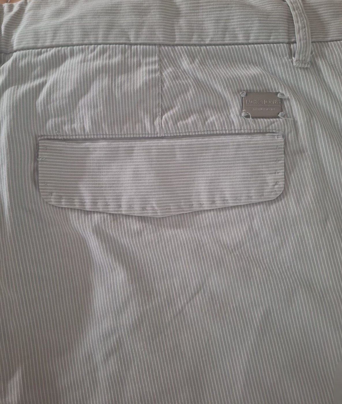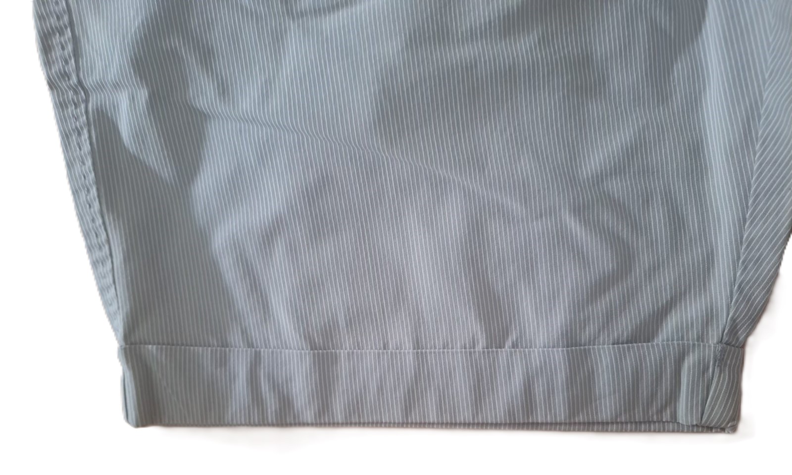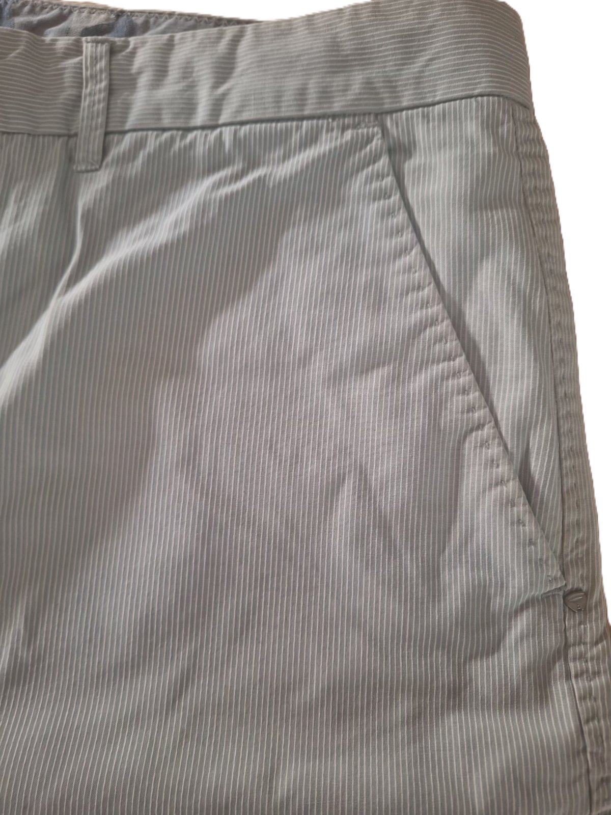 Šortky vo veľmi dobrom stave. Majú jemný prúžok - bielo sivý, materiál je bavlna, pekne prepracované na vonkajšej strane, ako aj vo vnútre. Odtieň na fotkách nemusí sedieť.