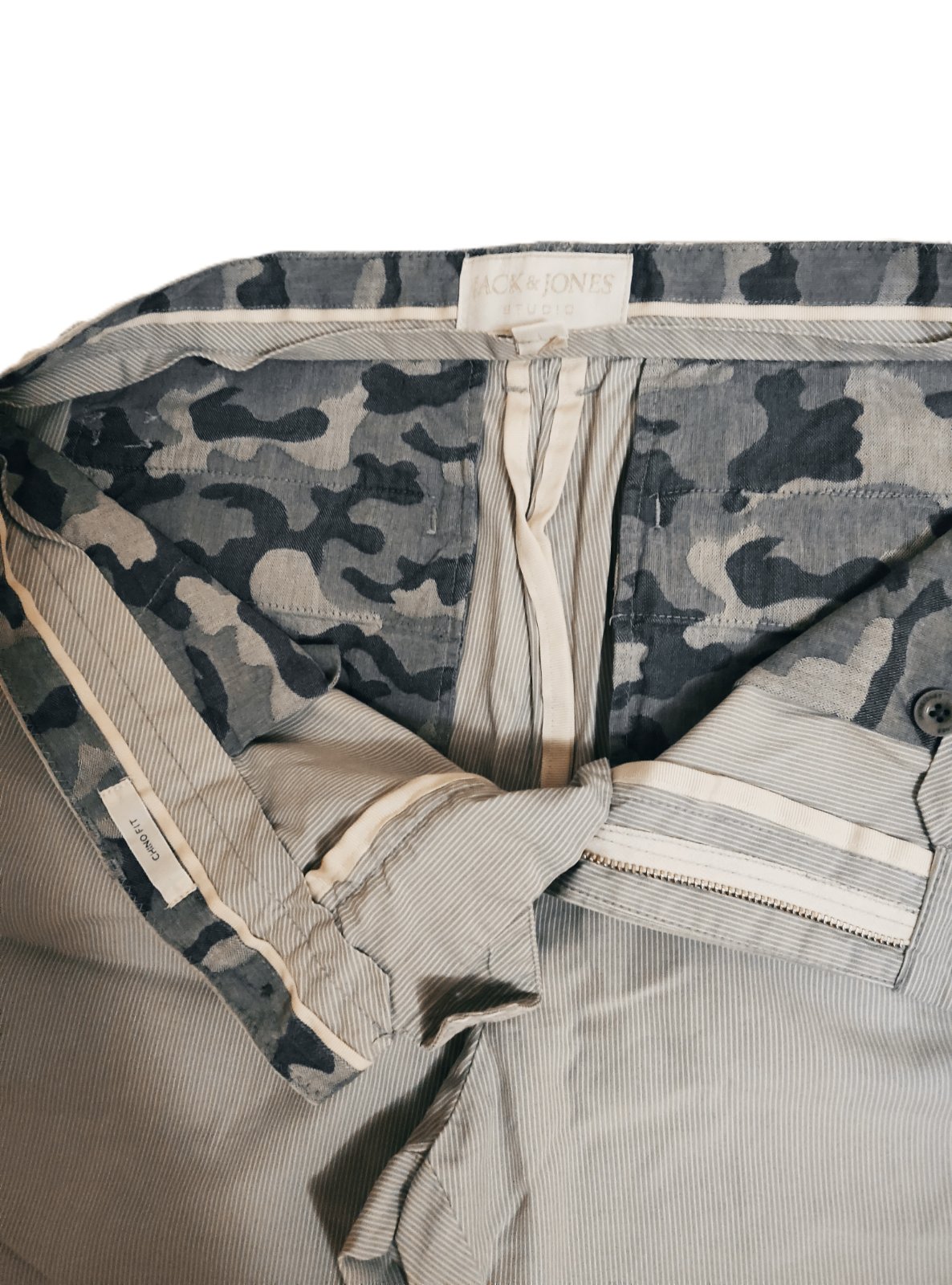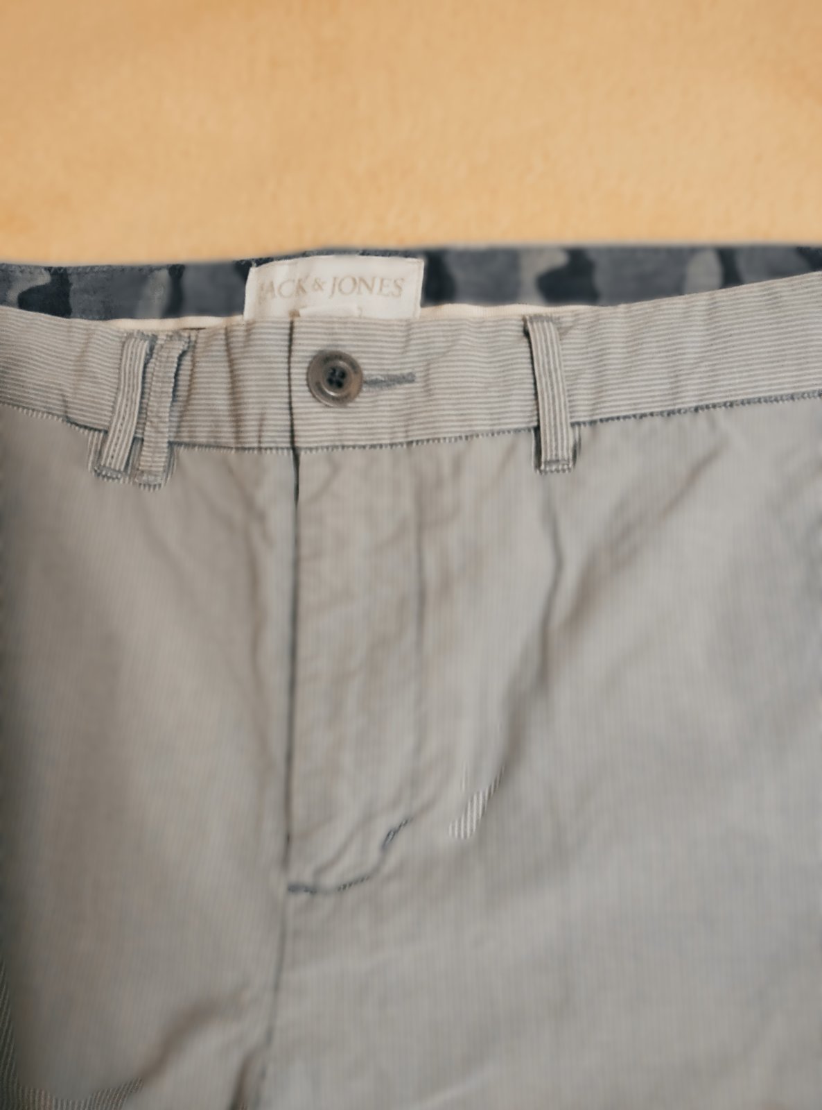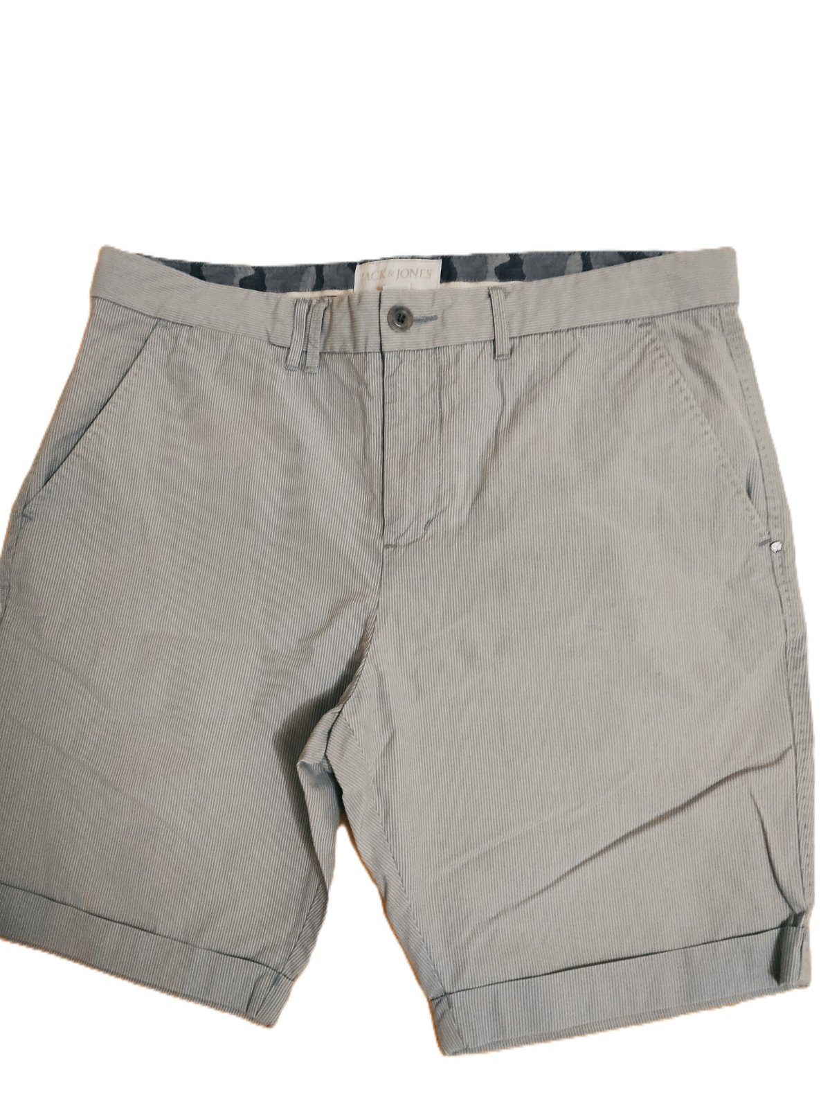 Šortky vo veľmi dobrom stave. Majú jemný prúžok - bielo sivý, materiál je bavlna, pekne prepracované na vonkajšej strane, ako aj vo vnútre. Odtieň na fotkách nemusí sedieť.