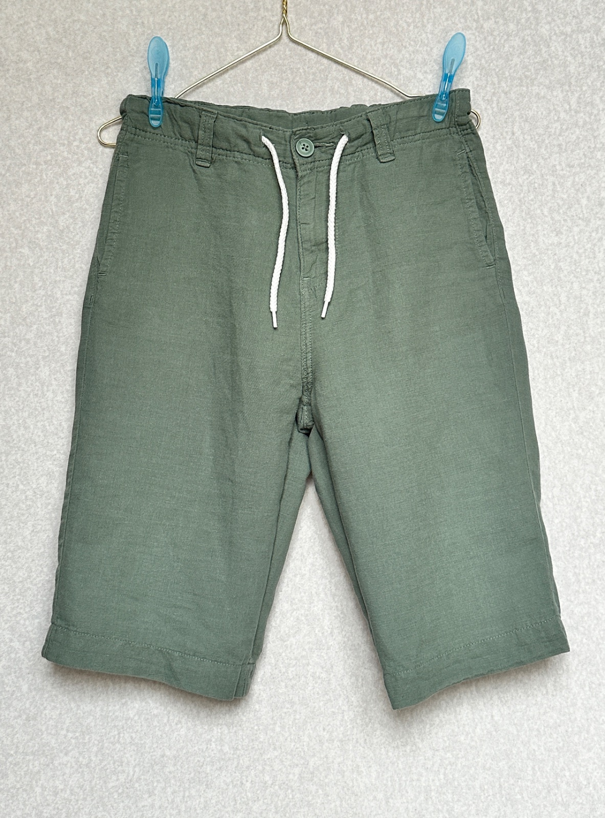 Klasické šortky z príjemného mäkkého vzdušného materiálu (55% ľan, 45% bavlna). Bočné aj zadné vrecká, v páse vo vnútri uťahovacia guma + uťahovacia šnúrka zvonku. Odtieň farby sedí s 1. a 2. foto. Pranie v pračke 40°C.