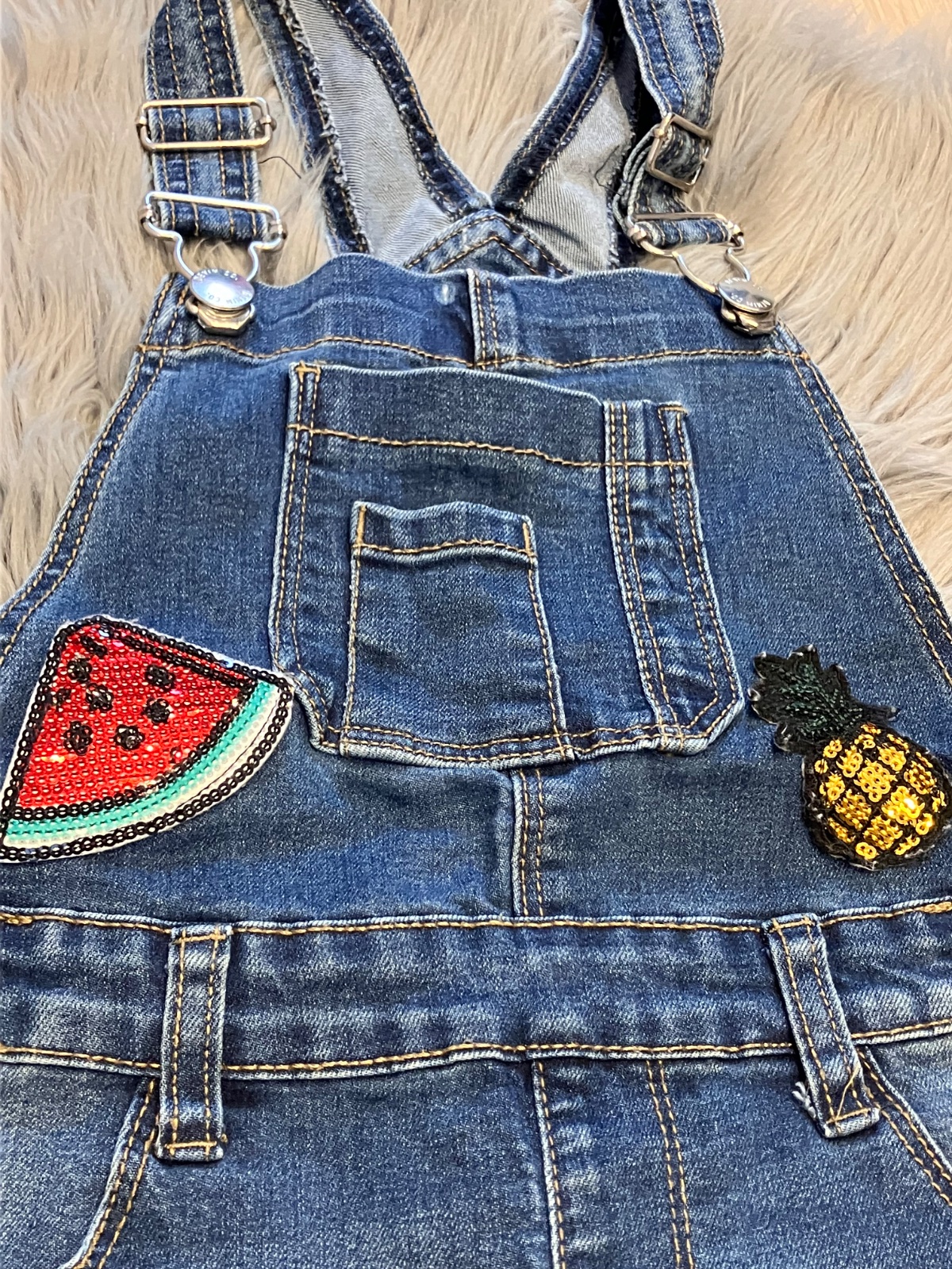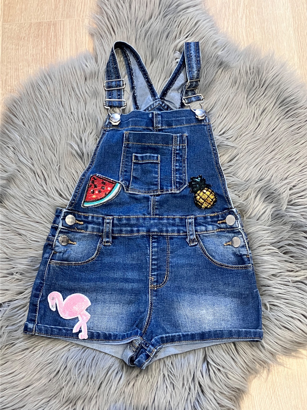 Dievčenské kraťasy na traky s lesklými vzormi, zapínanie na gombíky, elastické, materiál 73%bavlna 23%polyester 3%viskóza 1%elastan.