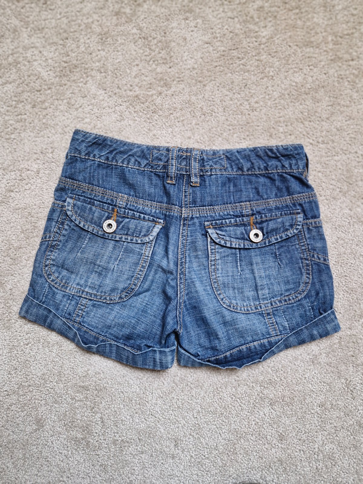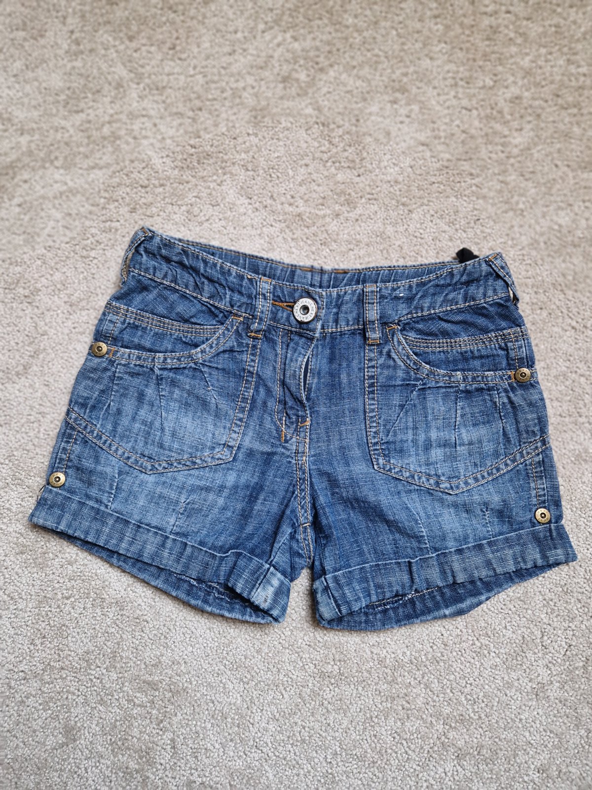 Krásne kratasy Next pre dievčatko 8-10rokov. Písané 128, regulovateľný pás, 62cm. Príjemná tenká riflovina.