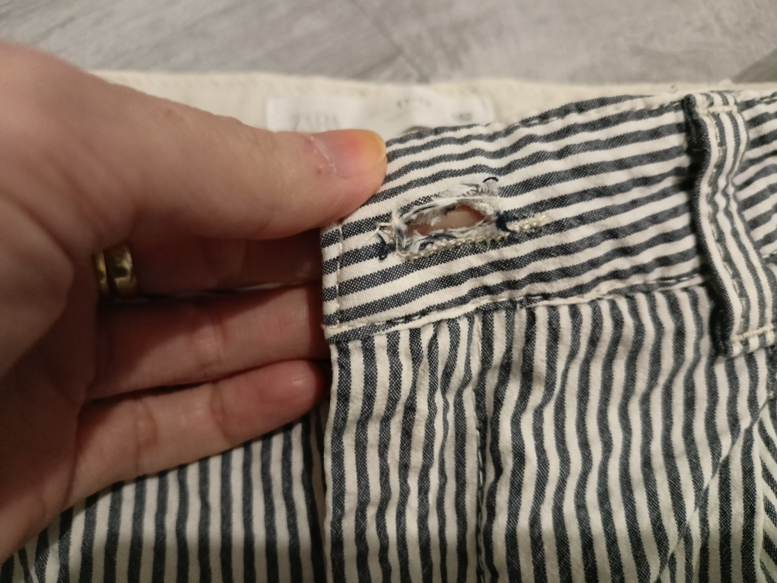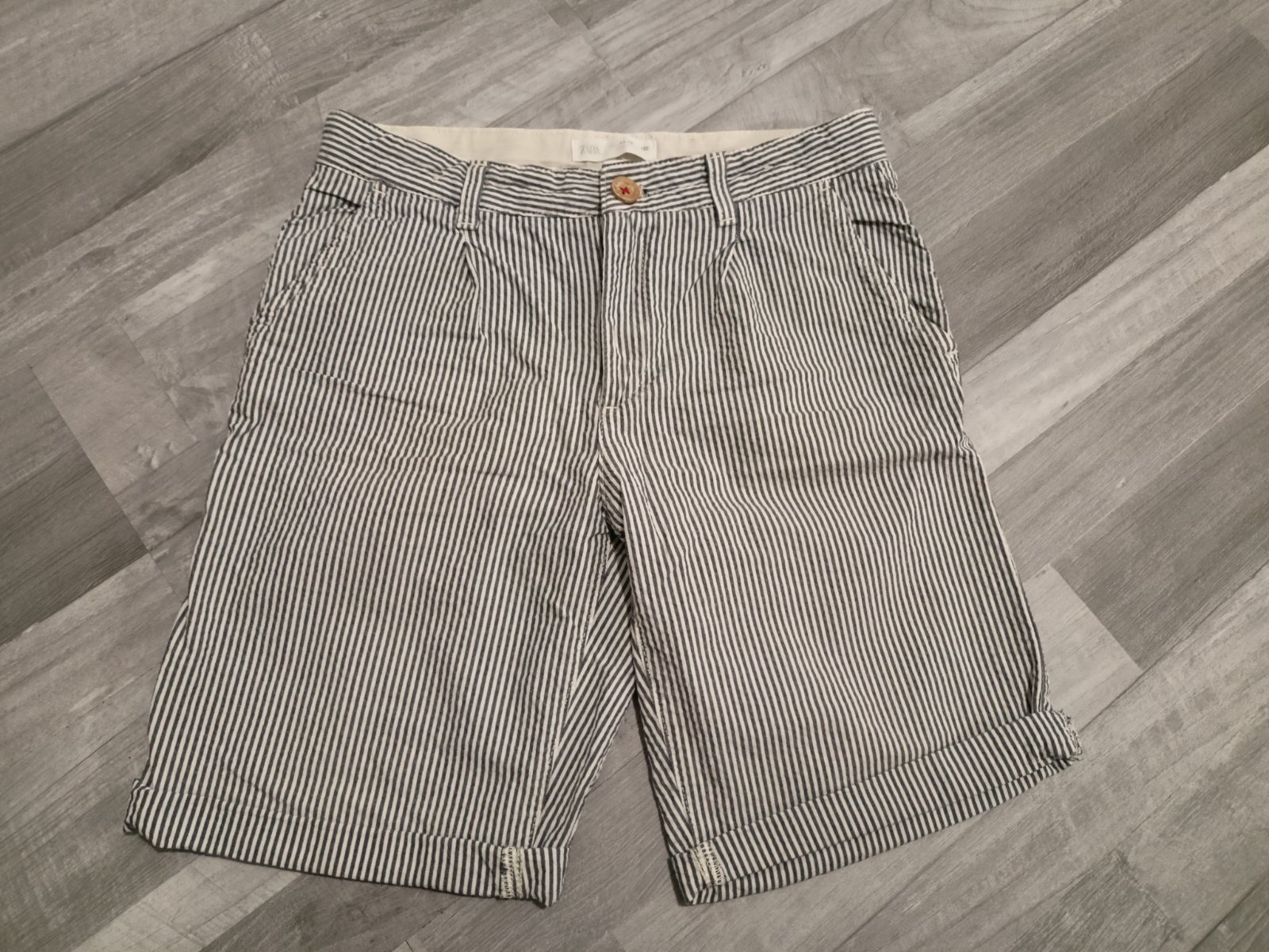 Kraťasy majú svetlo sivý prúžok. Sú v zachovalom nosenom stave. Iba kolo gombíkovej dierky je troška rozstrapkane(viď posledná foto). Nie je to veľmi vidieť, ale upozorňujem.