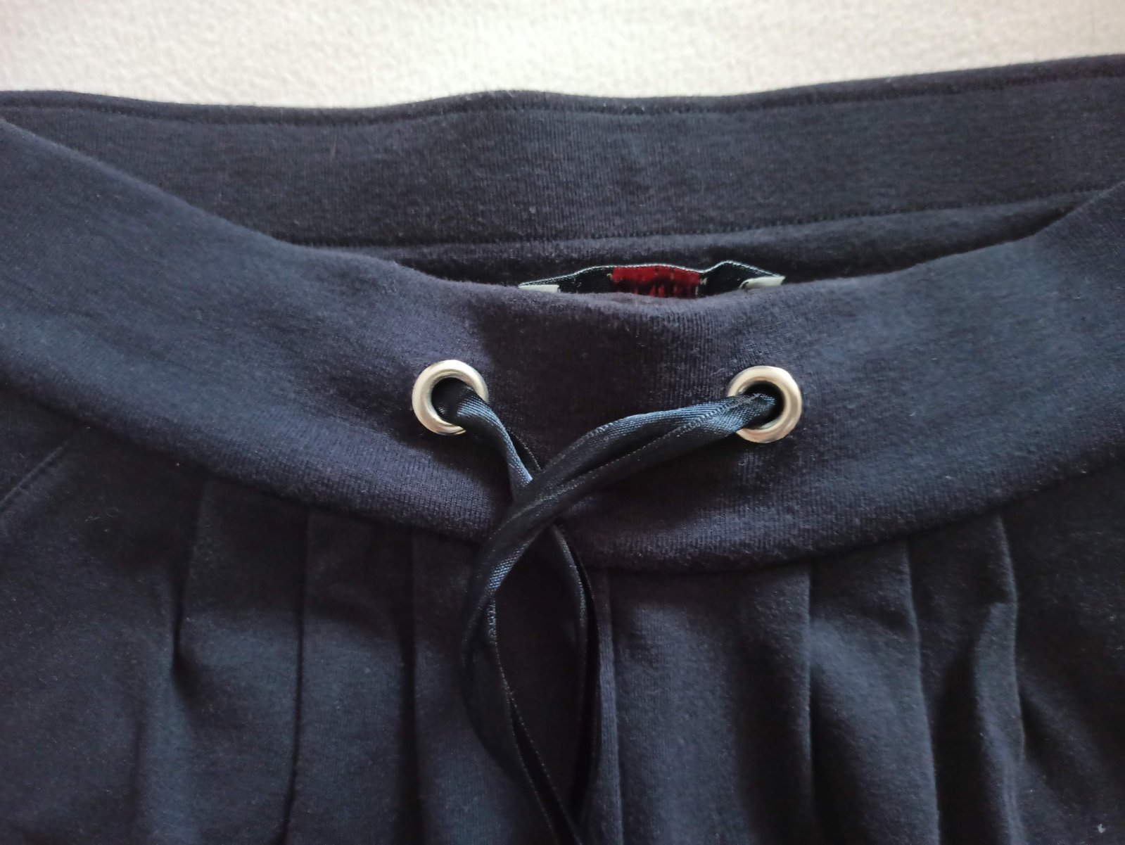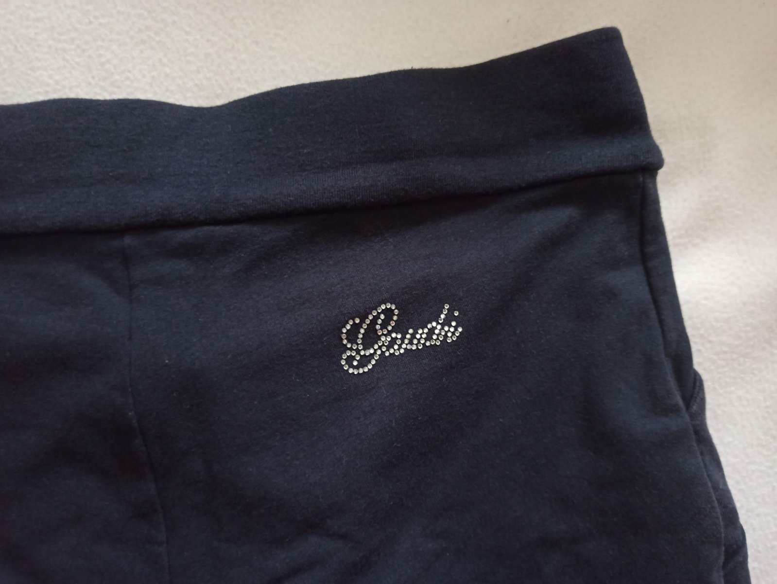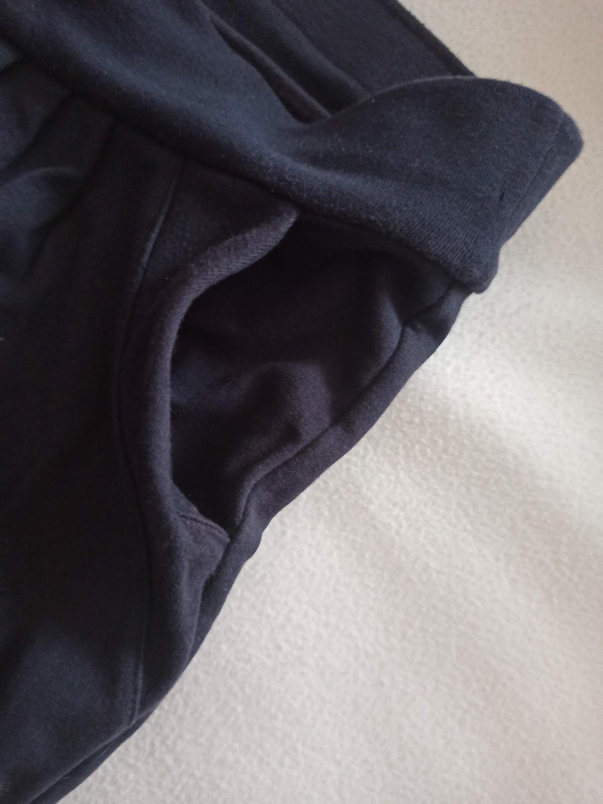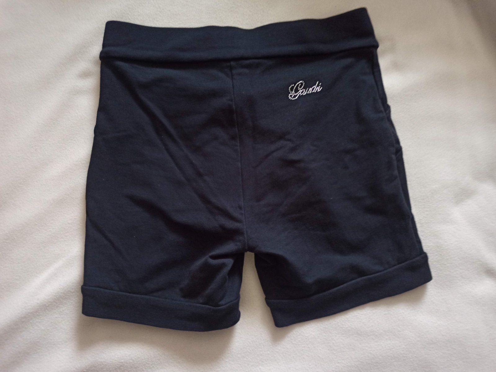 Tmavomodré šortky, dve vrecká, dĺžka 37 cm, šírka pása 37 cm, natiahnu sa, sedia na XS/S