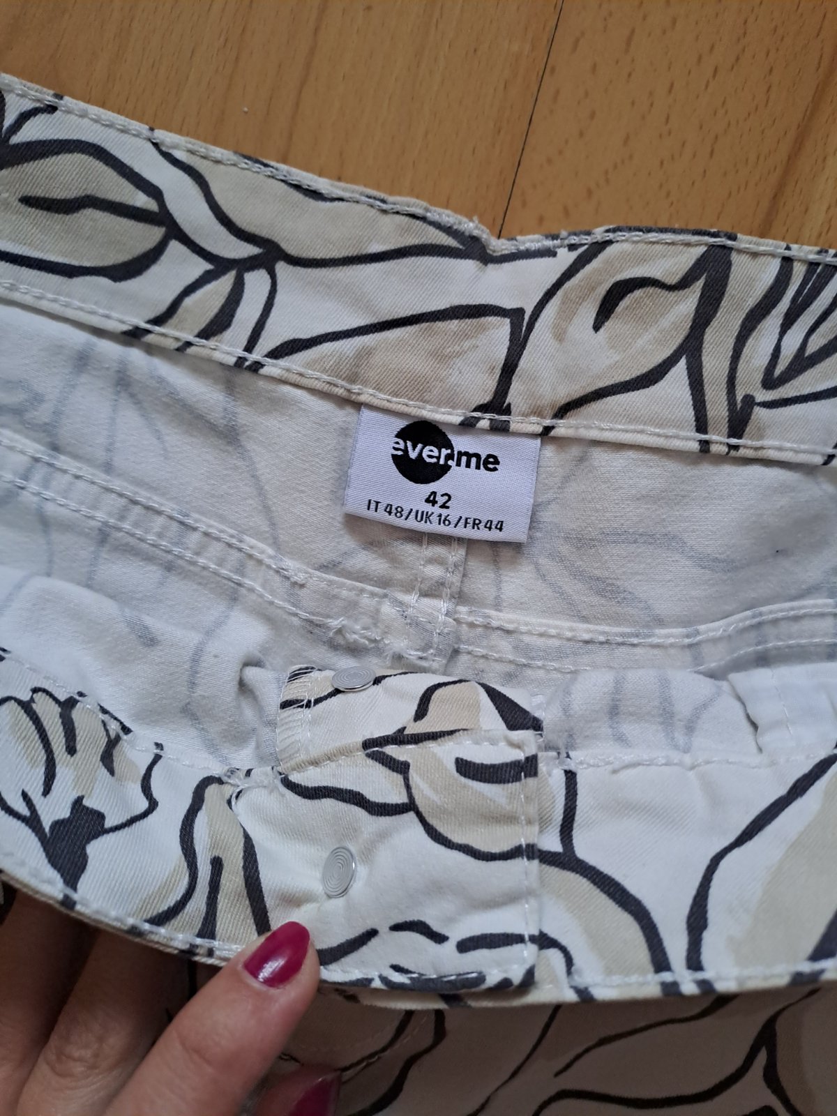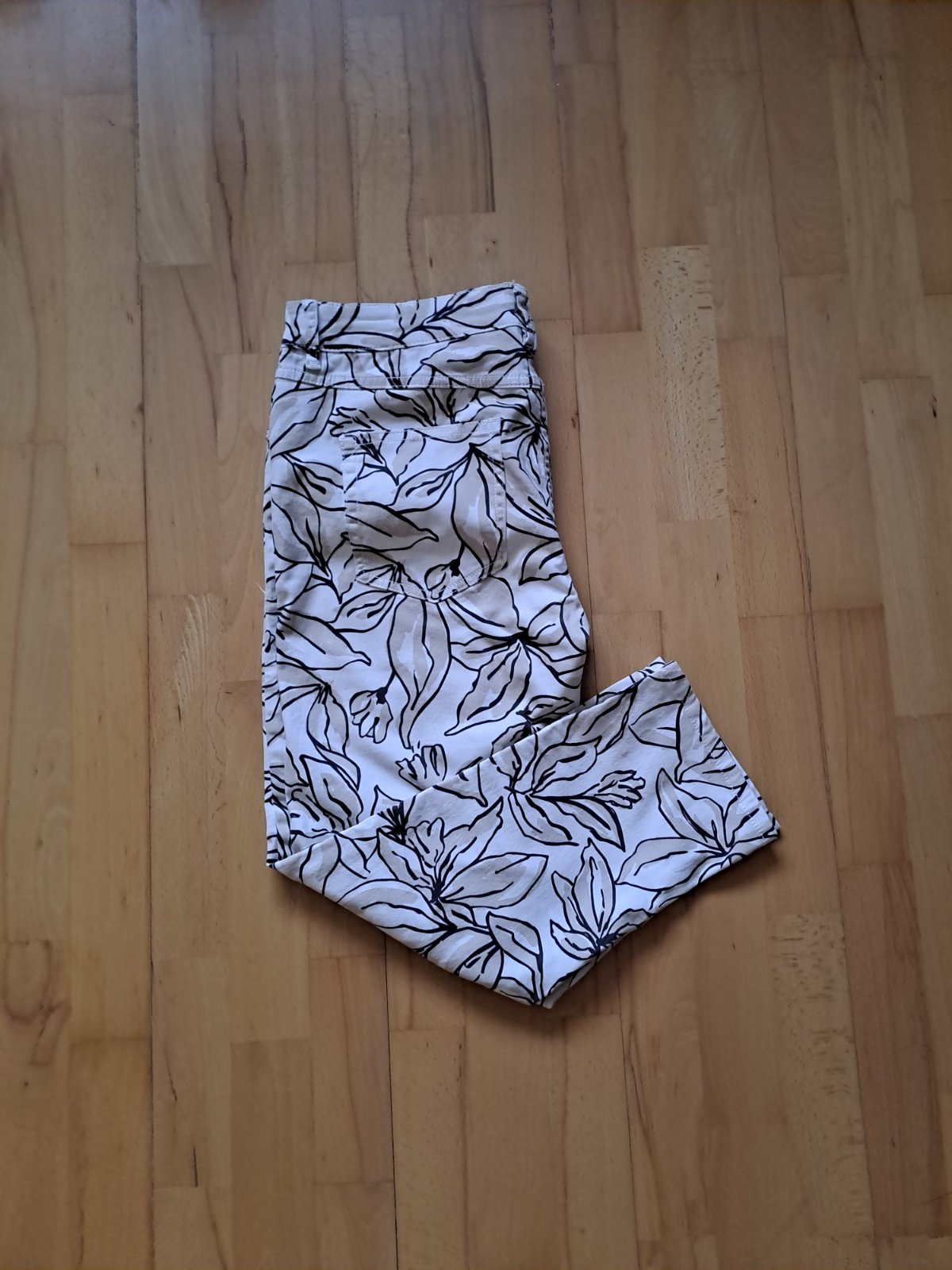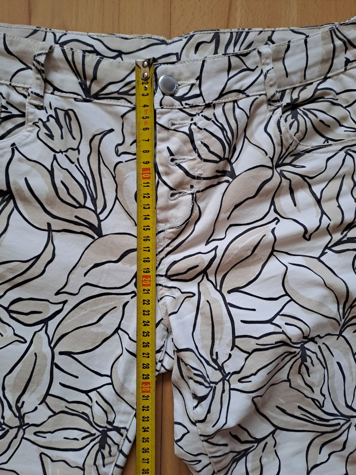 Ľanové nohavice v 3/4 dĺžke v bielej farbe. Majú vrecká na zips, stredne vysoký pás a ozdobné prešívanie. Sú vyrobené z 55 % ľanu a 45 % bavlny. Veľkosť na etikete je 42/44; všetky miery sú na foto...