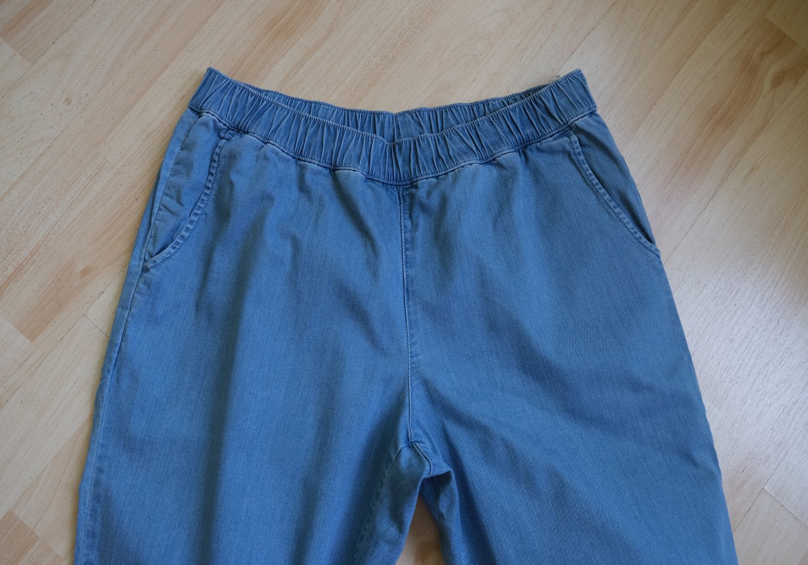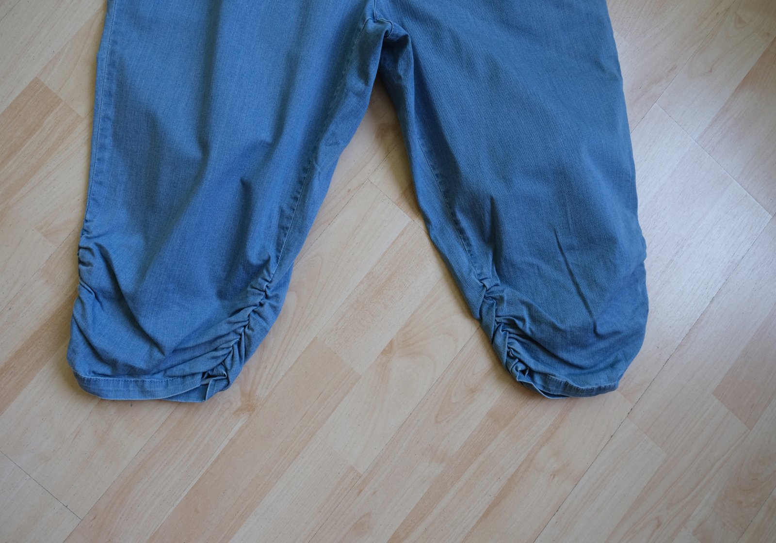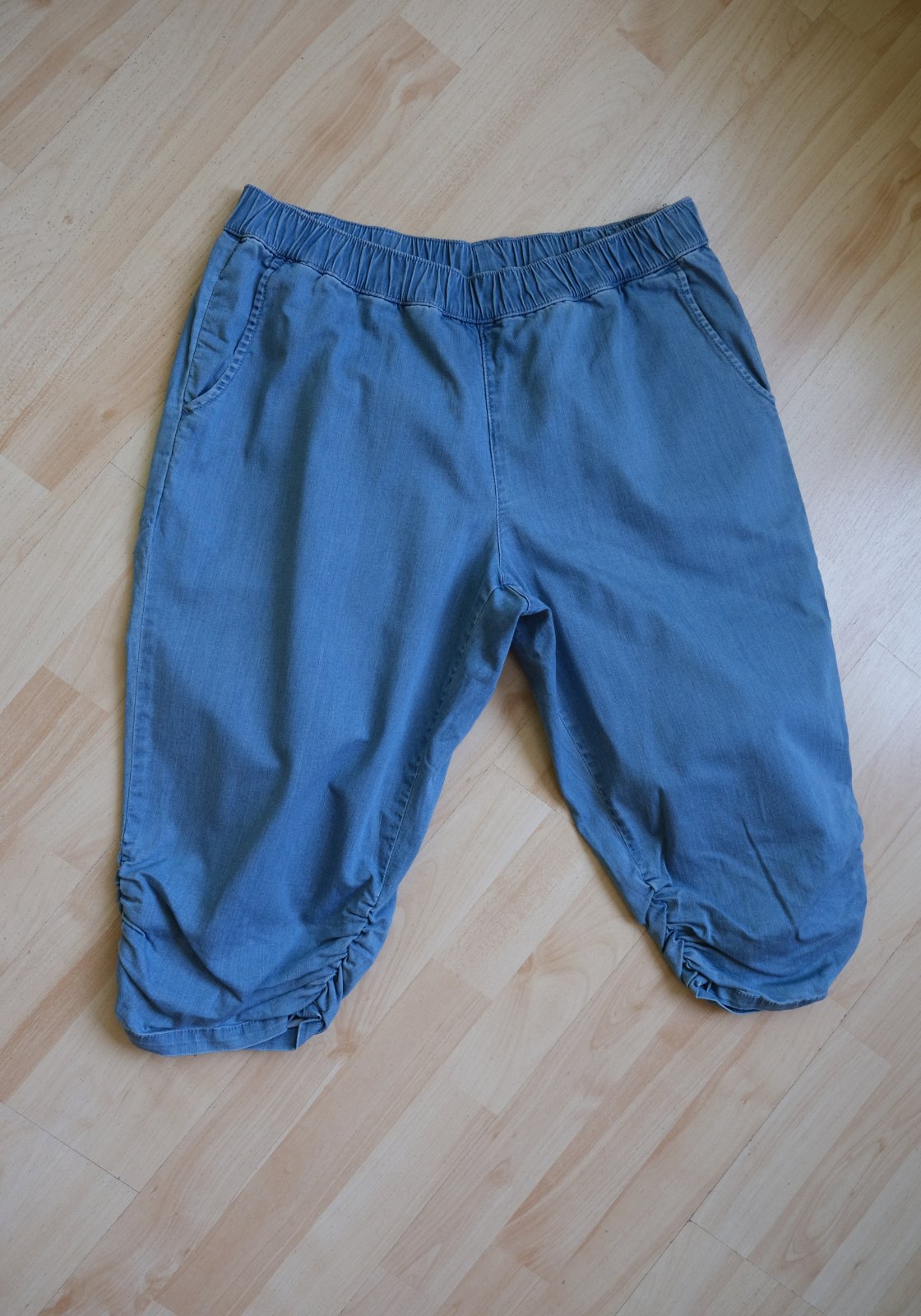 Popis tovaru: raz oblečené tenké 3/4 nohavice stiahnuté na kolenách celkovo voľný strih, velmi zachovalý stav boli prané, poslúžia na donosenie, nemajú žiadne vady ani poškodenia poslúžia na bežné nosenie,