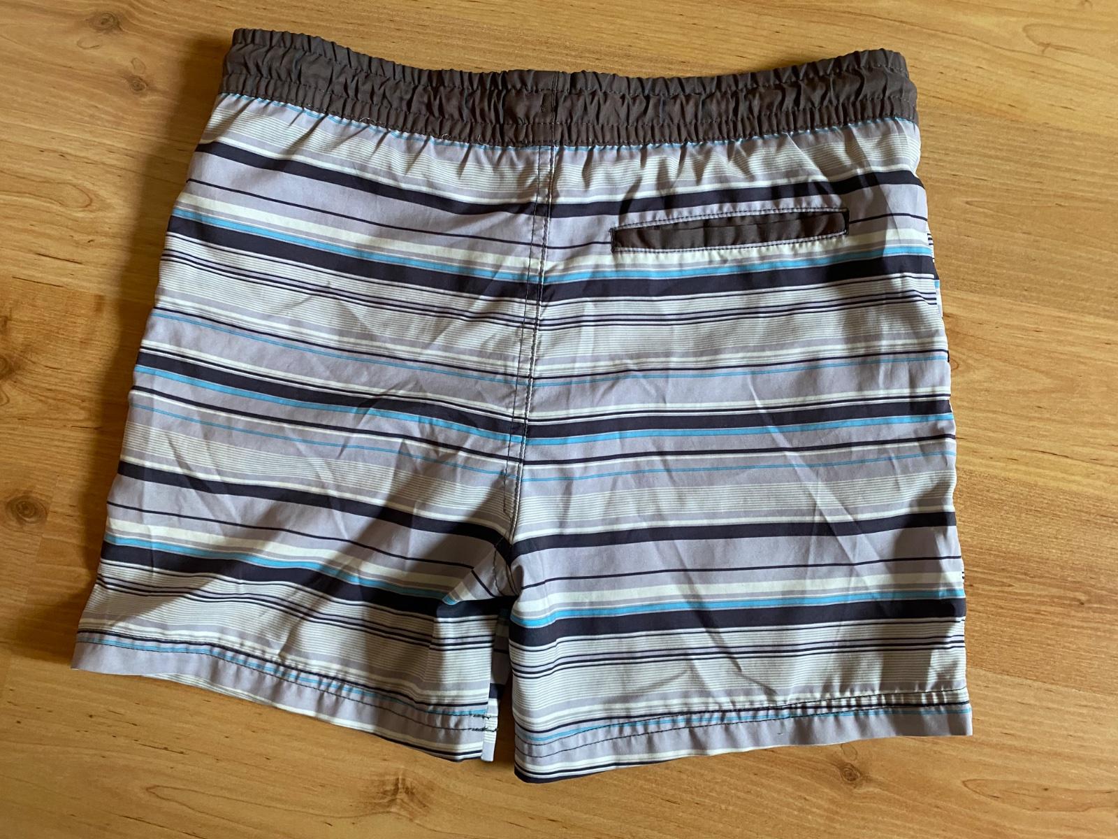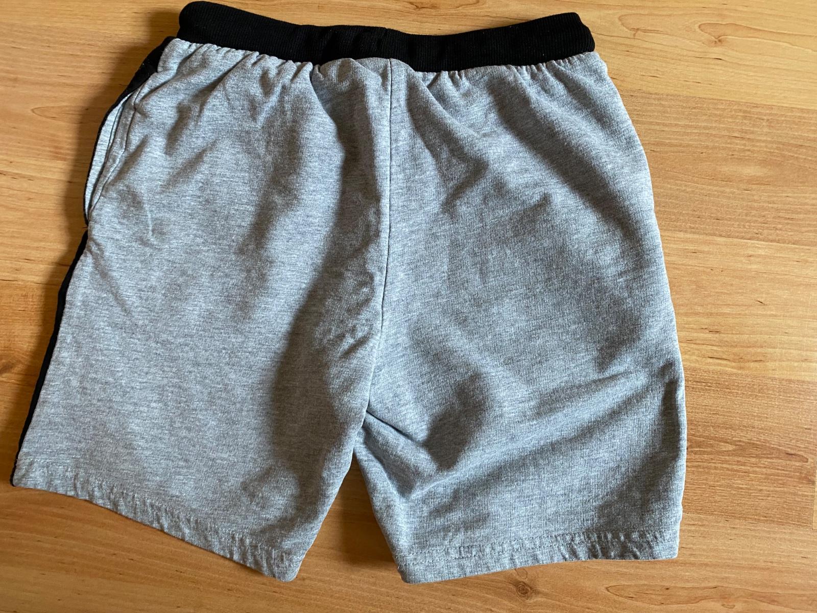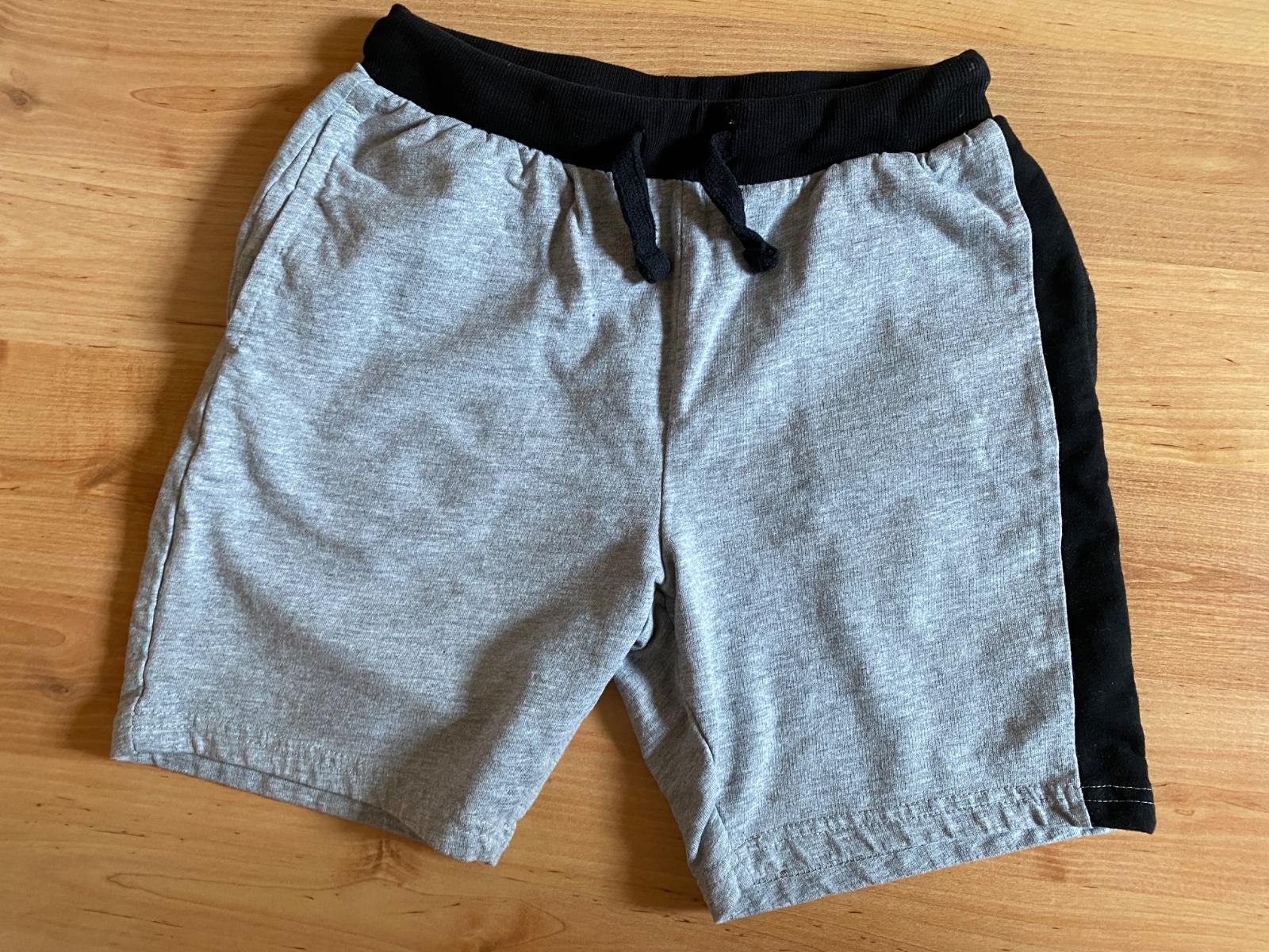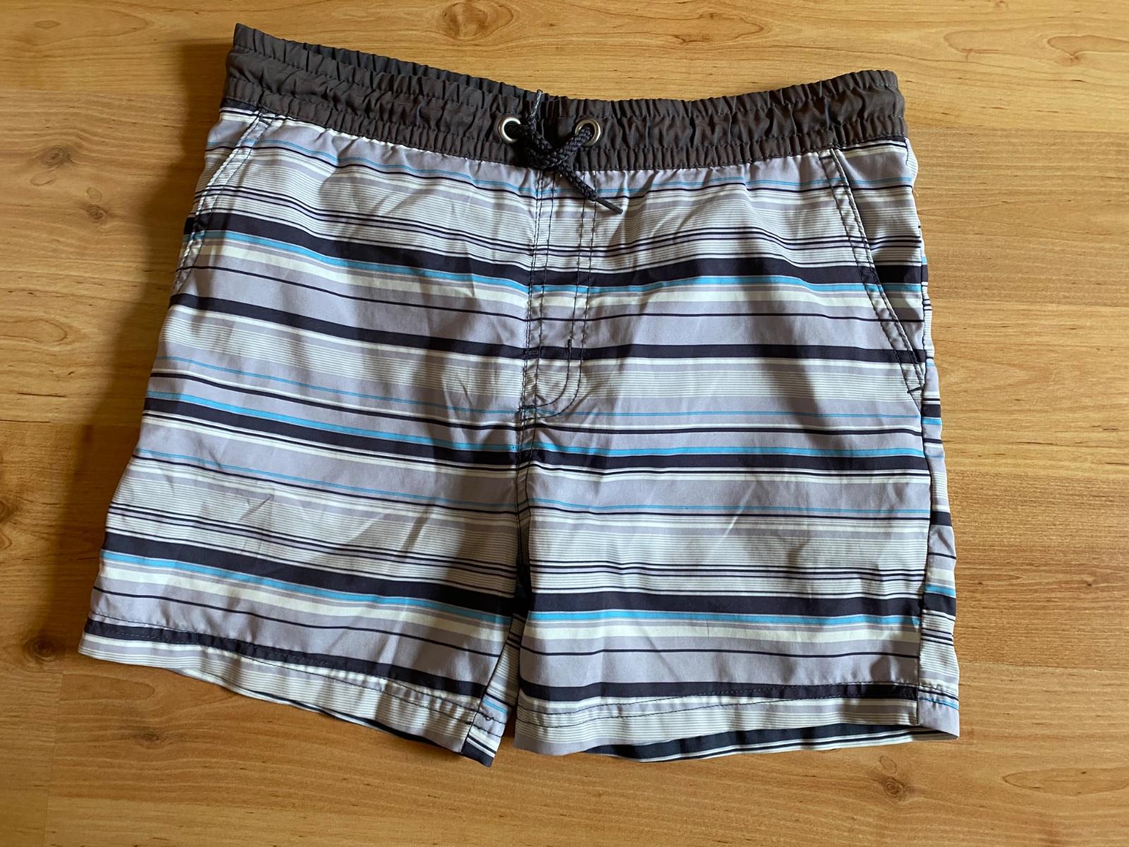Kraťasy 146/152. K tomu plavky- guma už vyťahaná, ale dajú sa stiahnuť šnúrkou- o číslo menšie, sle velkostne sú robnaké sko sivé kraťasy.