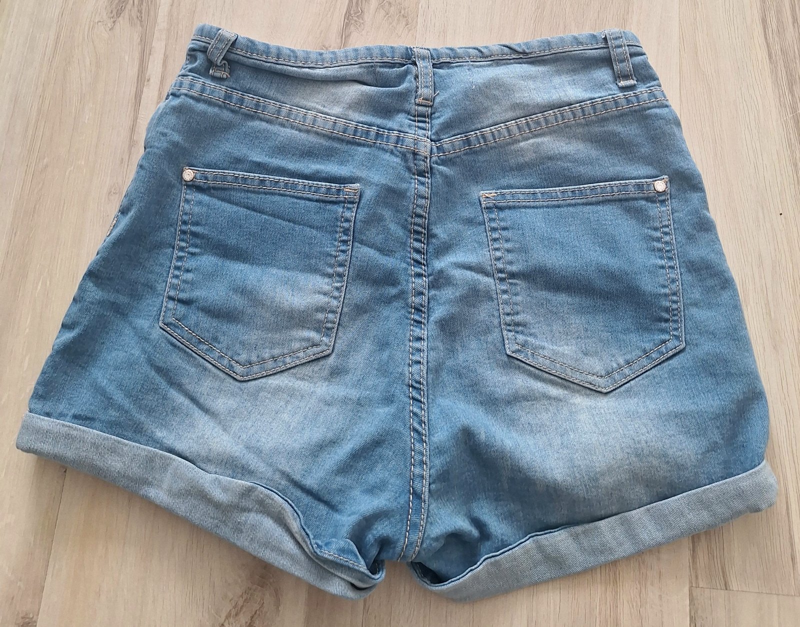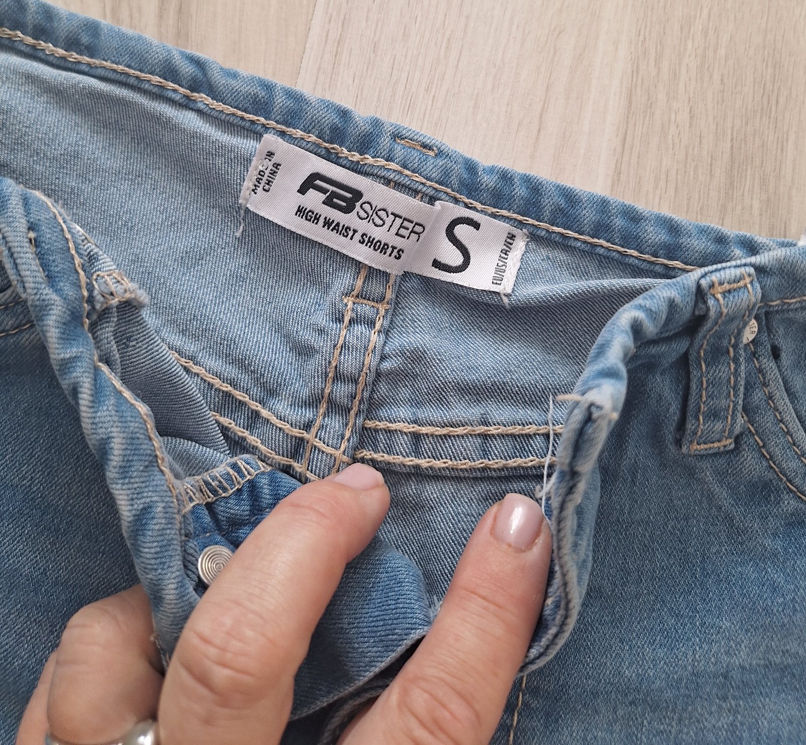 Par x oblečené riflové šortky,skôr volnejsi strih, nie su obtiahnute. Sú s vyšším pásom na gumičku, v kľude šírka v pase 33 cm, natiahnu sa až na 39 cm.