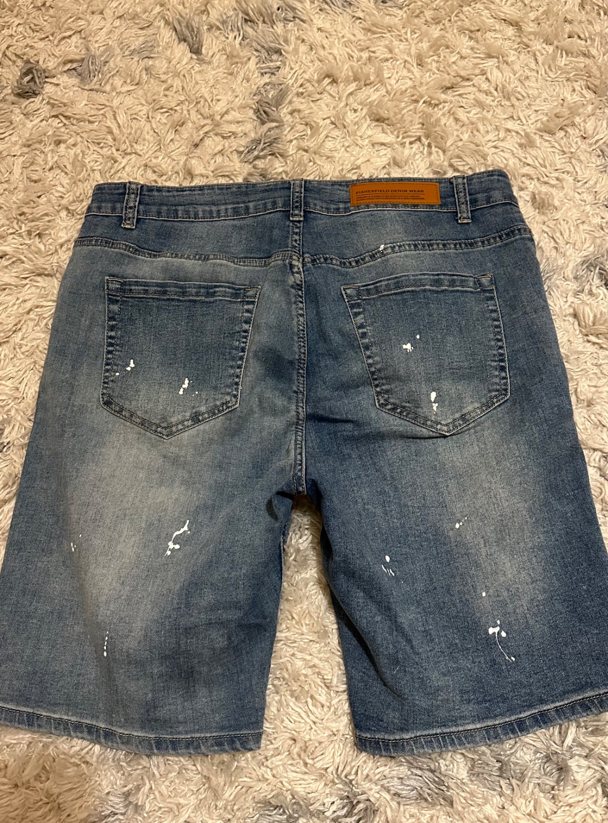 Riflove chlapcenske kratasy,, original blaznivo pokreslene, trhane, synove velmi oblubene. Vel.uvedena 40, je to asi.panska M, riadte sa podla rozmerov D 51cm, S boky 55cm x2, pas 42x 2. Zapinanie ...