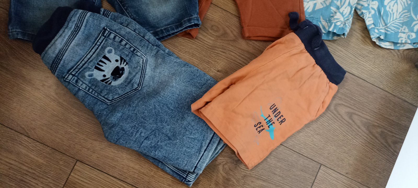 Prvá foto tretí rad riflové a tehlové Zn. Next , biele s palmami Zn. H&M. Spodný rad Lupilu.