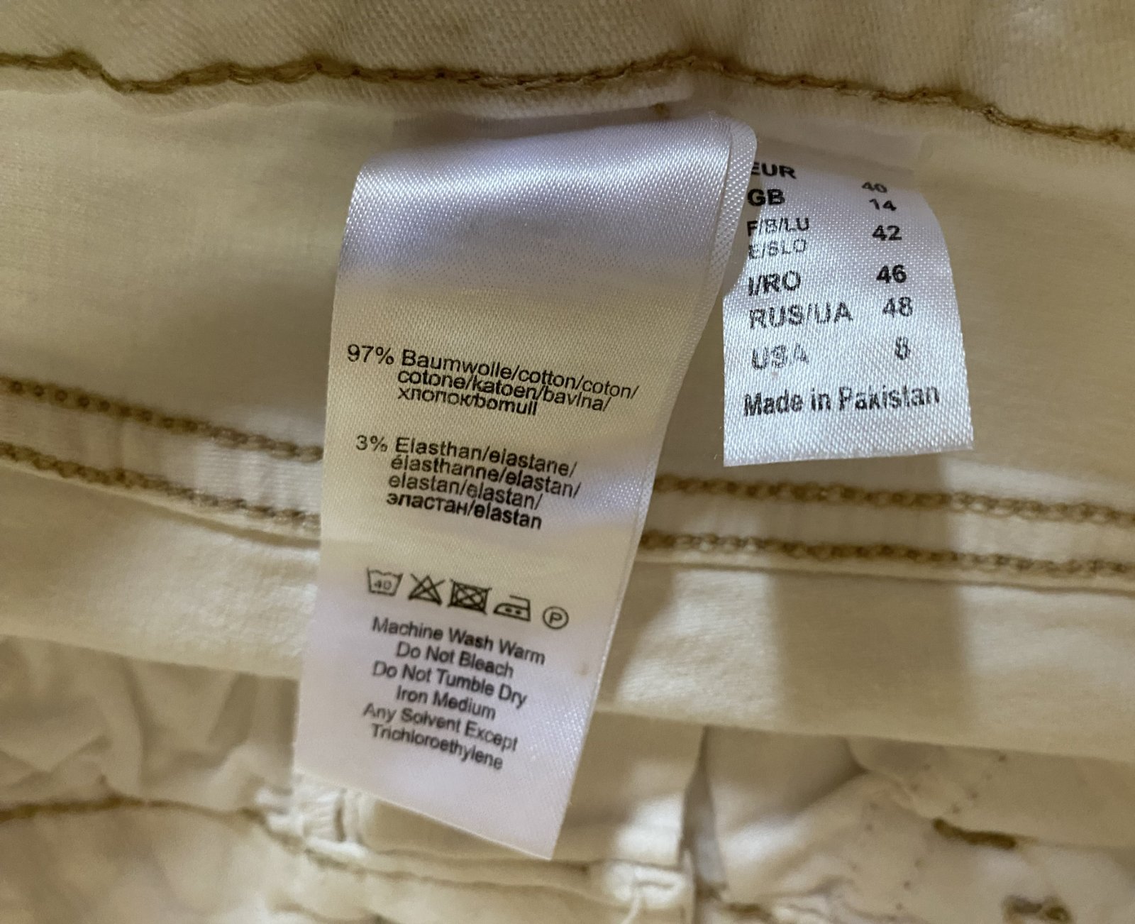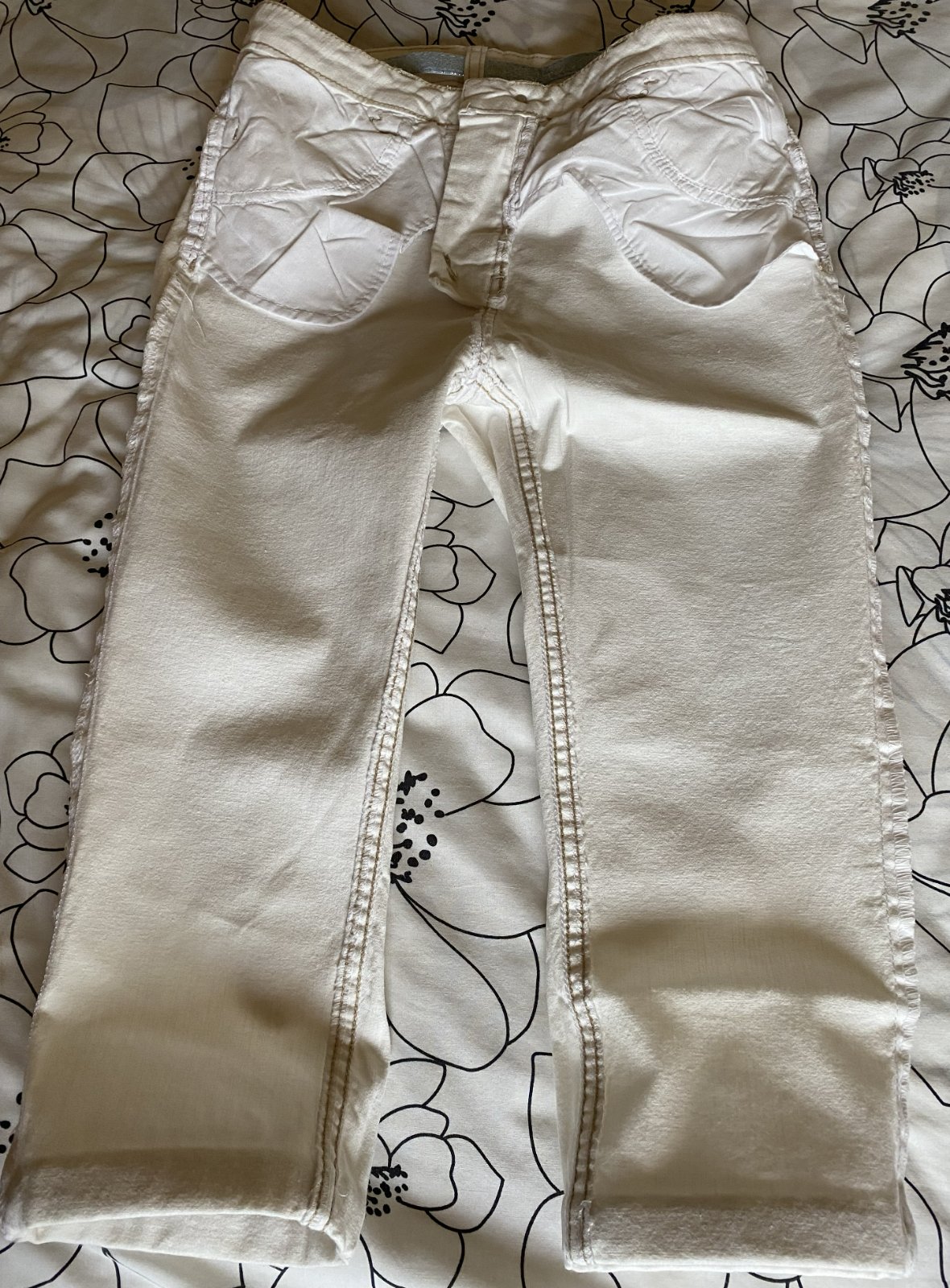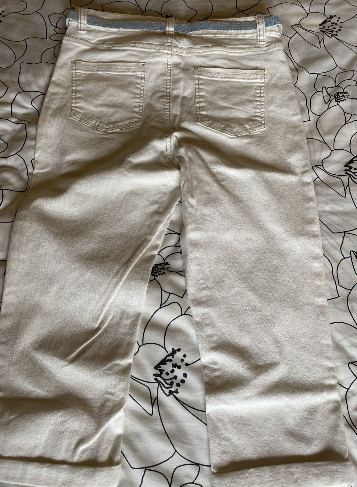 Capri nohavice s opaskom v. 40, kvalitne prepracované, kopa pekných funkčných detailov - viď detail. foto. Miery merané v kľude, sú pružné, všade povolia (materiál 97% bavlna, 3% elastan: bočná dĺžka: 72cm, vnútorná dĺžka po sed: 46cm, pás: 38-40cmx2, šírka mieste sedu: 26cmx2, šírka spodná časť: 18cmx2.