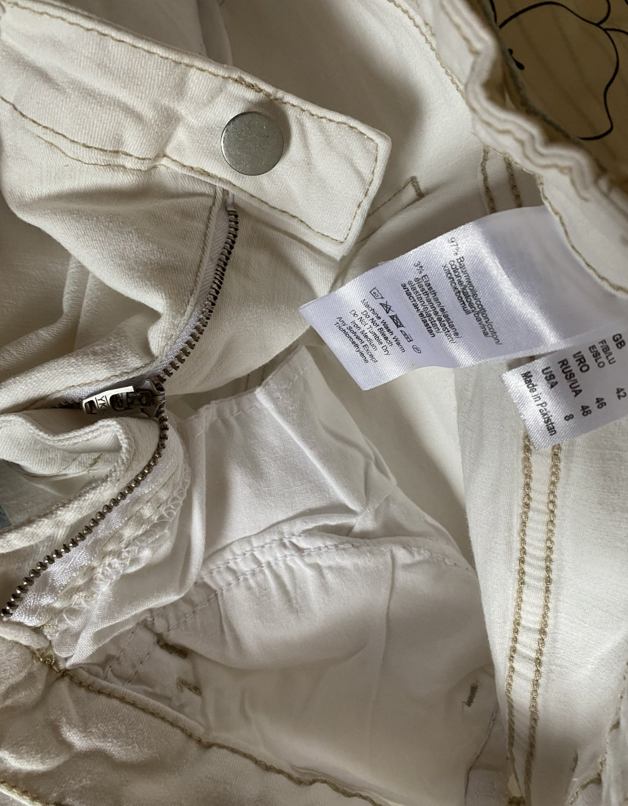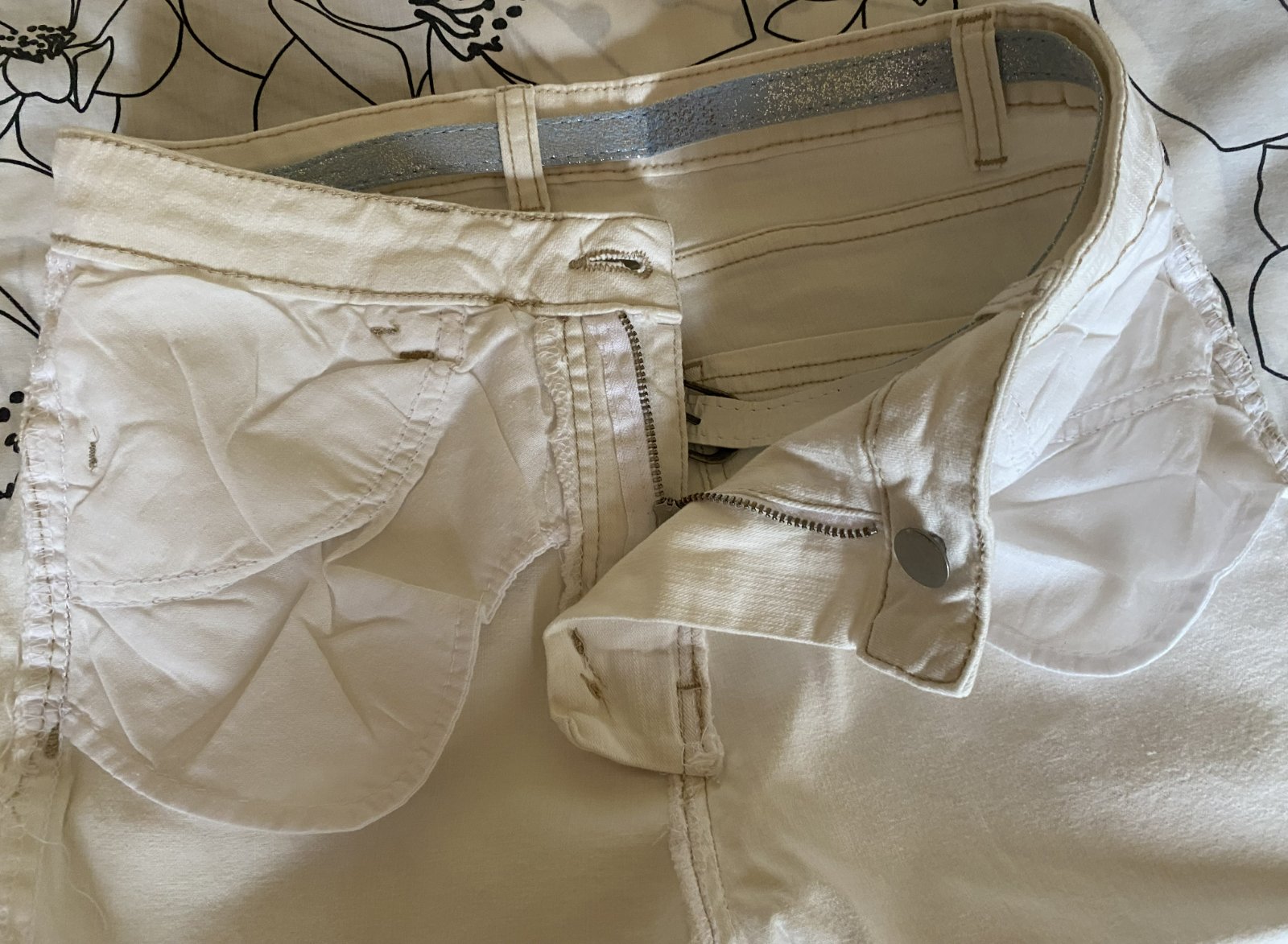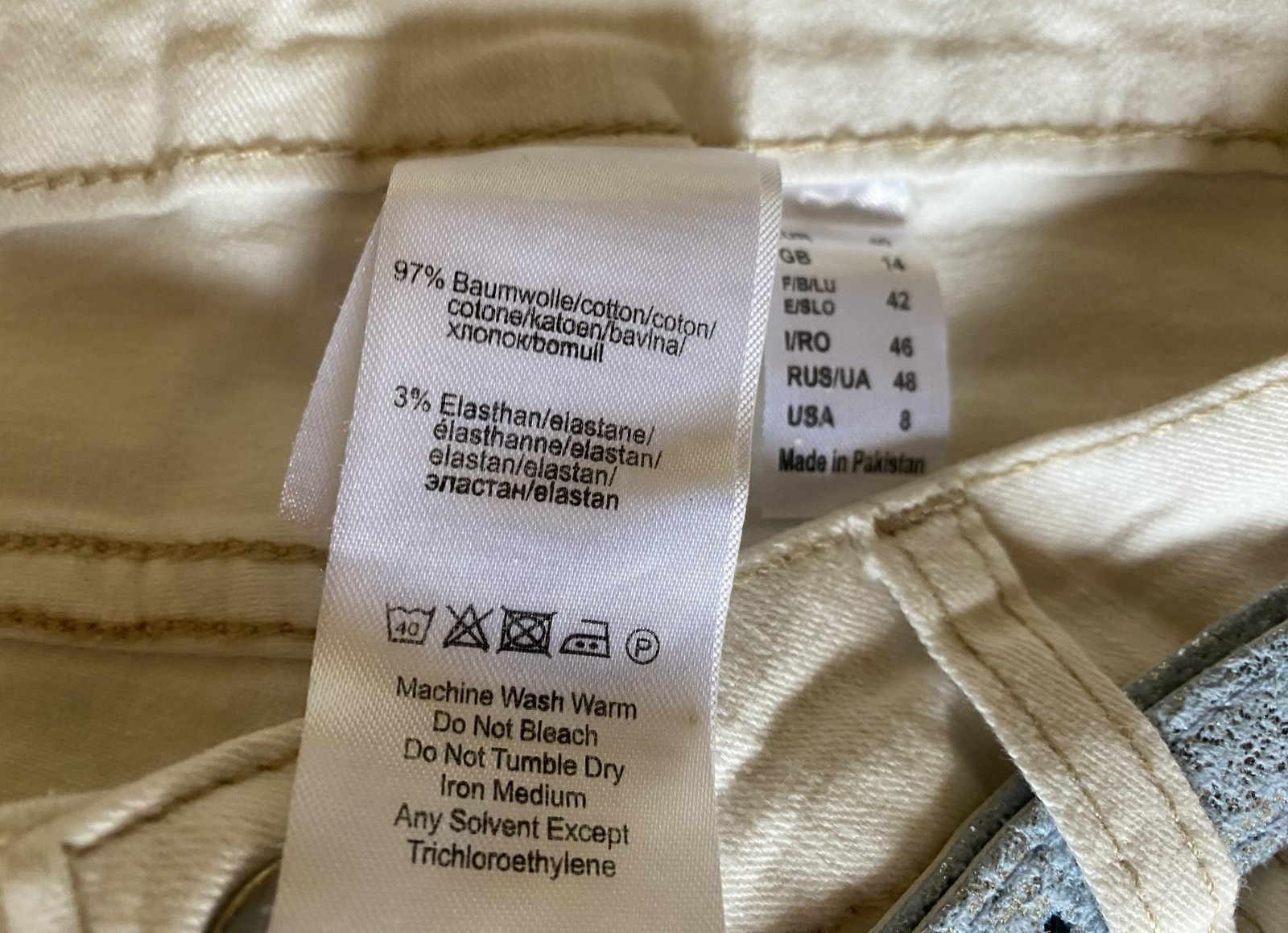 Capri nohavice s opaskom v. 40, kvalitne prepracované, kopa pekných funkčných detailov - viď detail. foto. Miery merané v kľude, sú pružné, všade povolia (materiál 97% bavlna, 3% elastan: bočná dĺžka: 72cm, vnútorná dĺžka po sed: 46cm, pás: 38-40cmx2, šírka mieste sedu: 26cmx2, šírka spodná časť: 18cmx2.