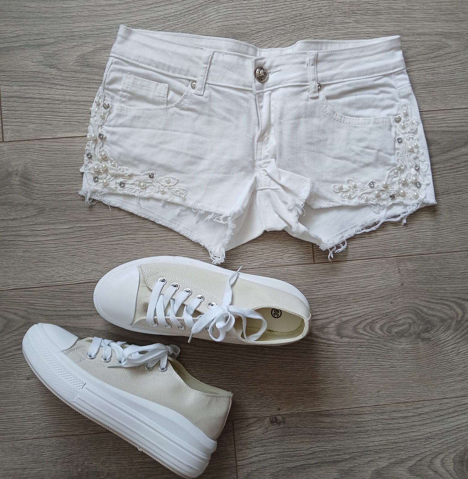 Biele široké kraťasy z vreckami, zo 100 % bavlny,rozmery viď foto, veľmi zachovalé a bez poškodenia.
