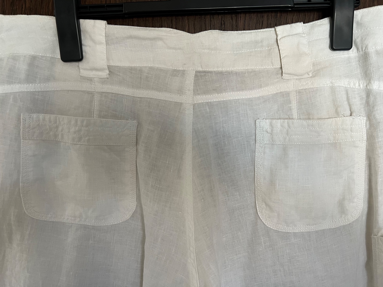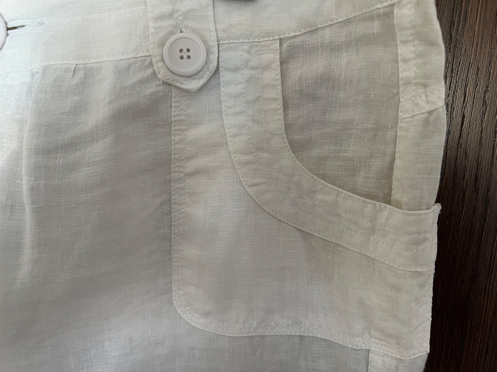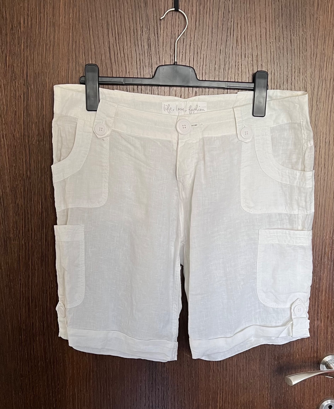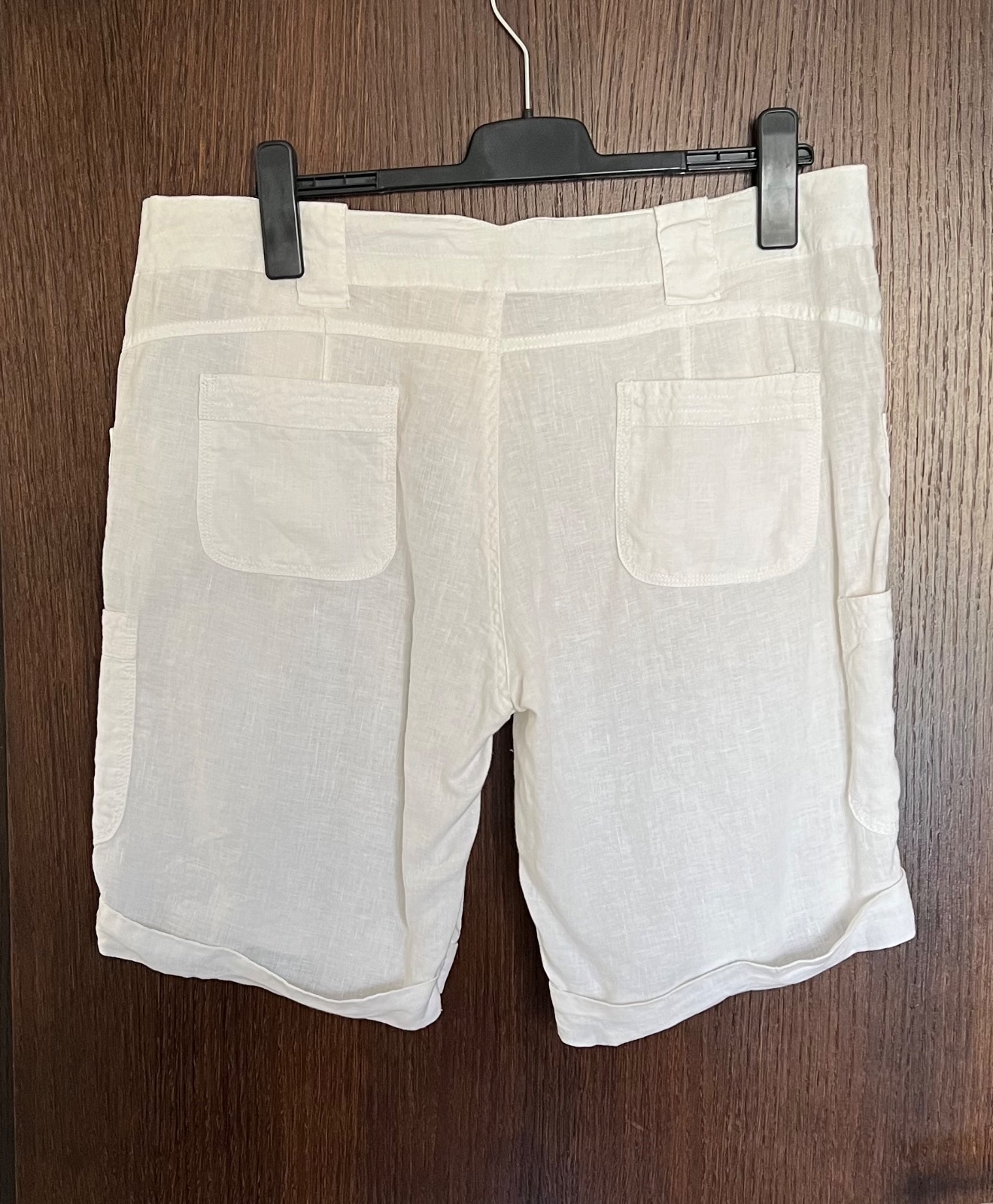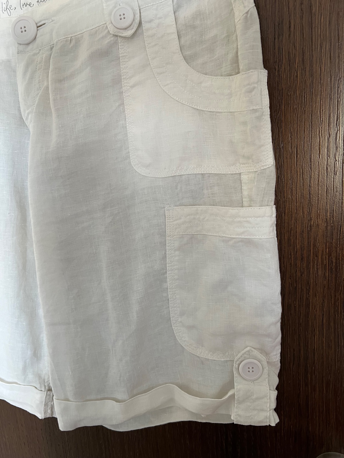 Pohodlné biele kraťasy z príjemného materiálu, ideálne na teplé dni. Majú klasické bočné vrecká a dekoratívne aplikácie vo forme ďalších vreciek, ktoré im dodávajú štýlový vzhľad. Skvelé na prechádzky, voľnočasové nosenie alebo letné výlety.