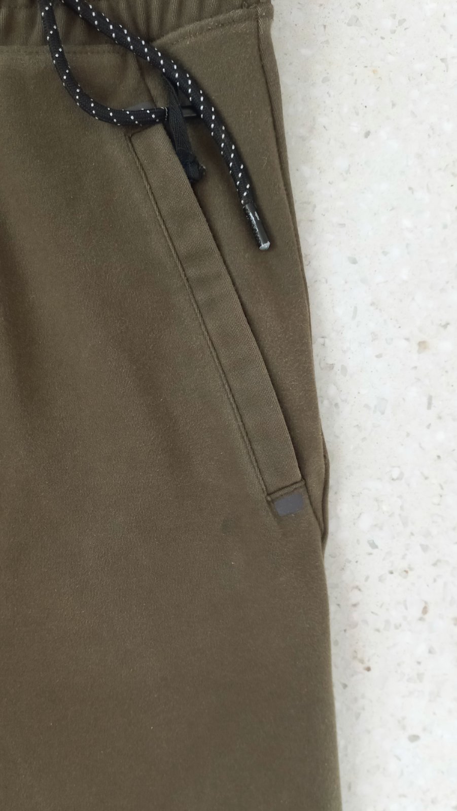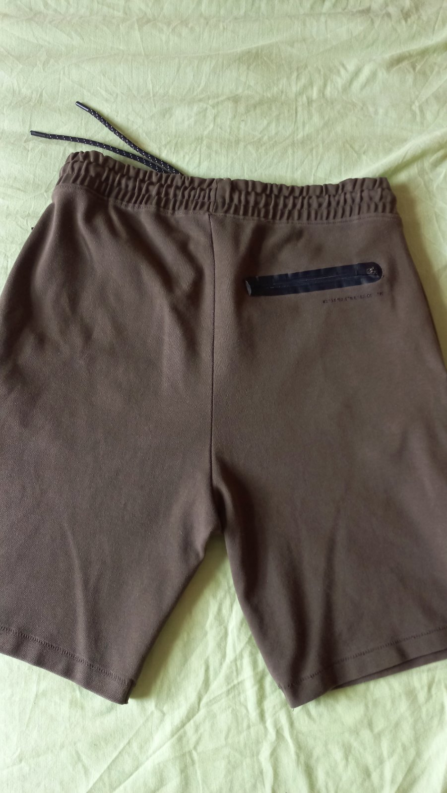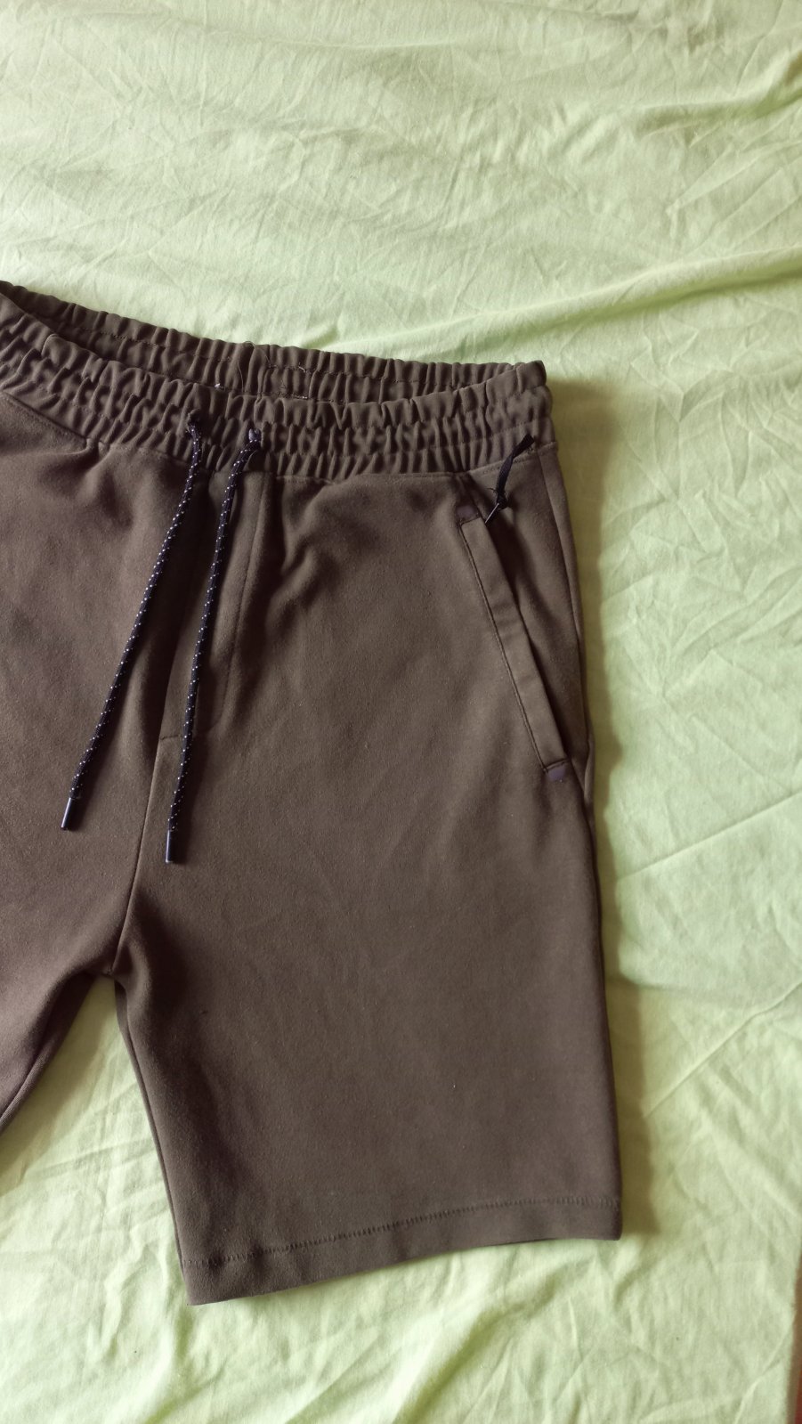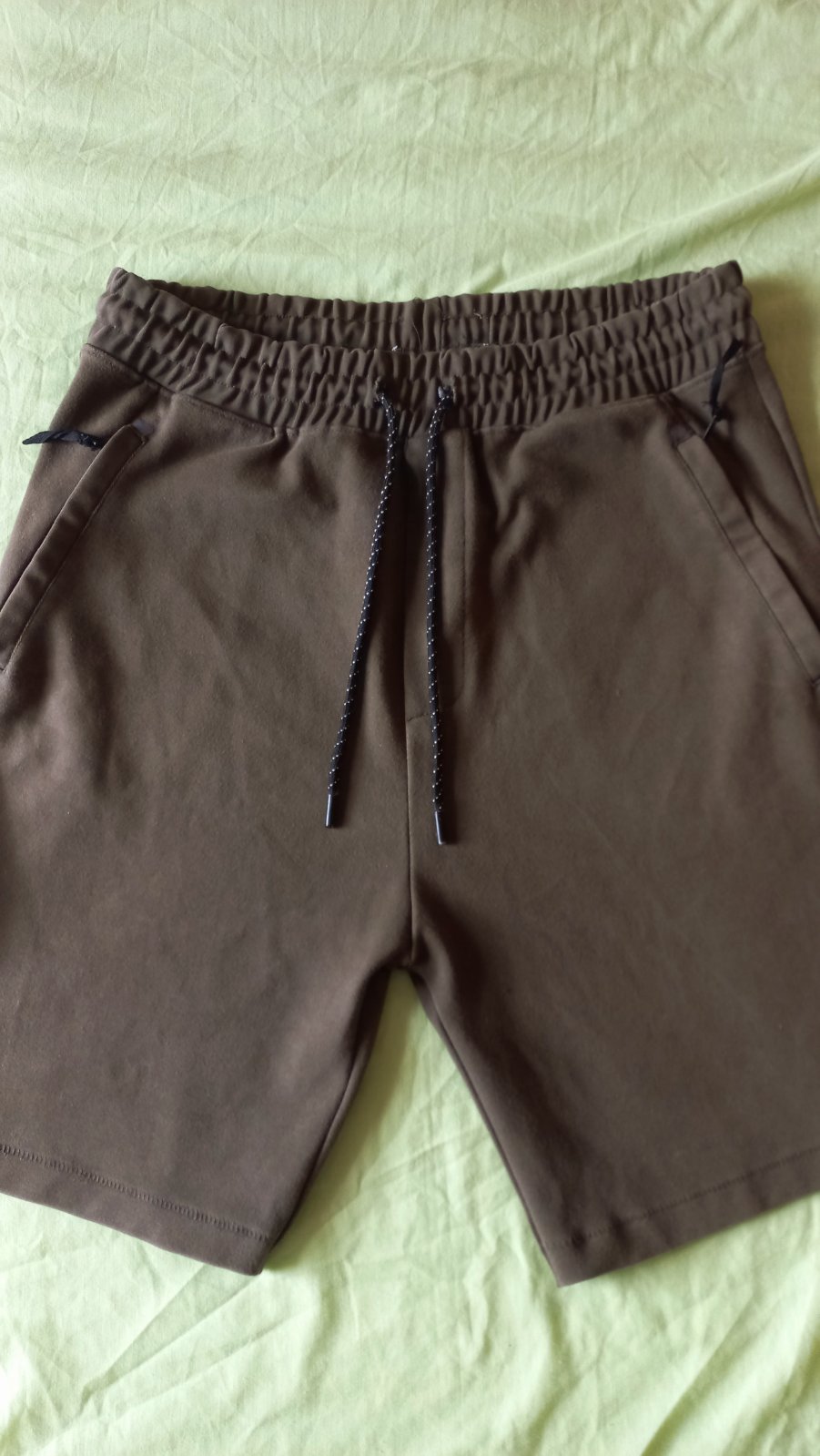 Pánske krátke nohavice, v páse šnúrka. Vrecká vpredu aj vzadu. Farba je khaki. Na fotke sa trocha láme do hneda. Pri vrecku majú maličký jemný fliačik, čo si človek všimne, len keď sa uprene zadíva. Vid foto 5