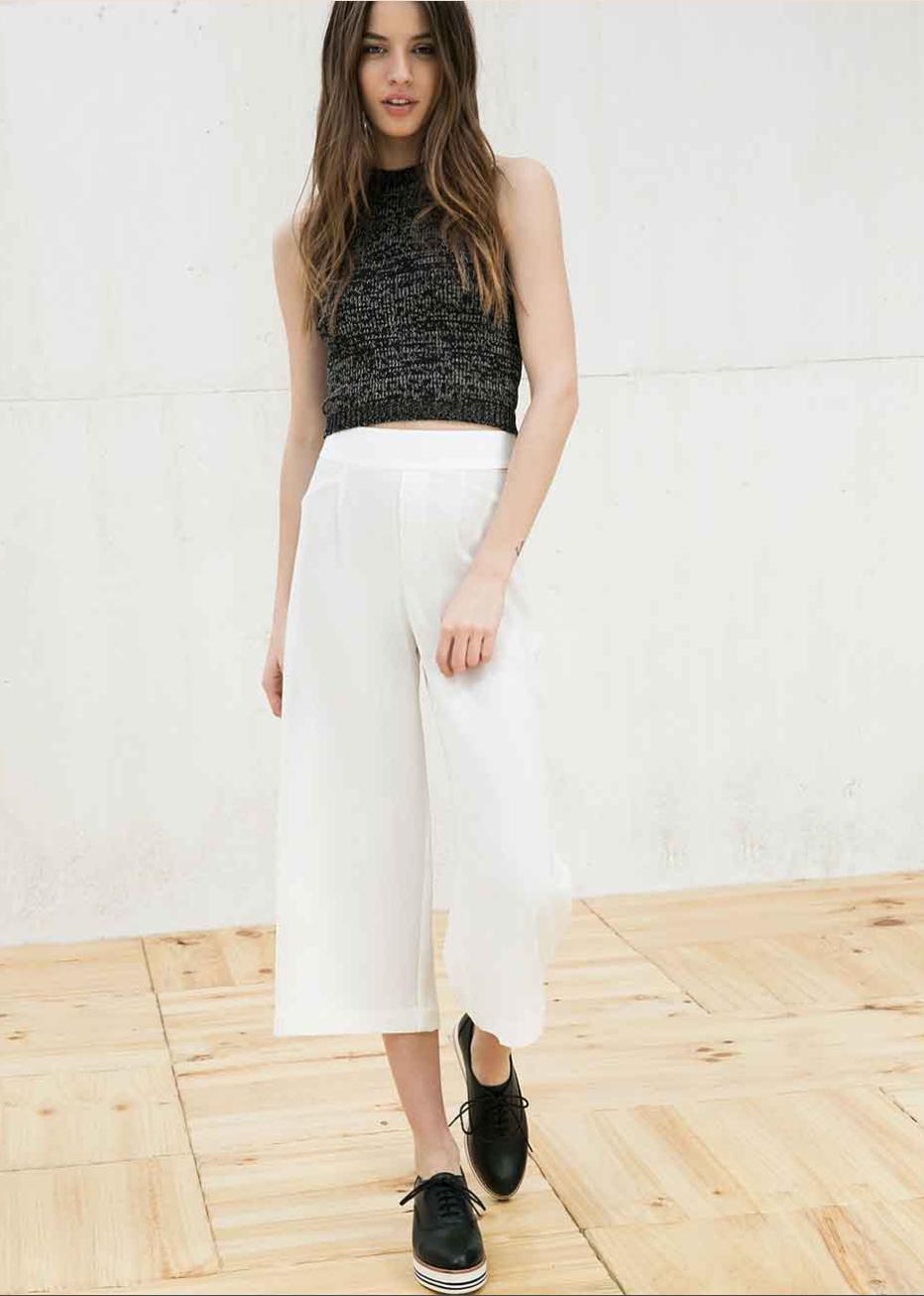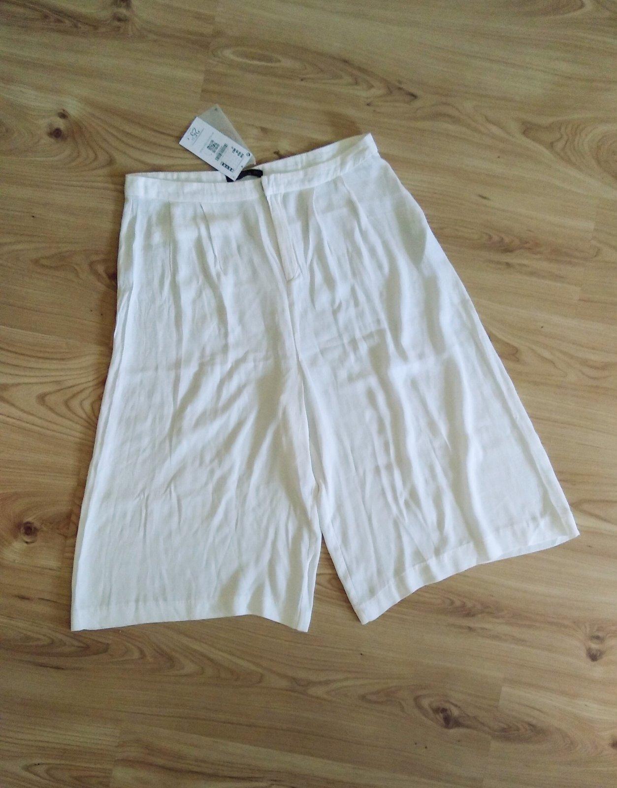 Horúci trend sezóny! Culottes (alebo kulotky) sú široké nohavice trojštvrtinovej dĺžky siahajúce až do pása. Vpredu zapínanie na zips a skrytú gombičku, vzadu falošné vrecká. Farba smotanovo biela, sú bez podšívky.