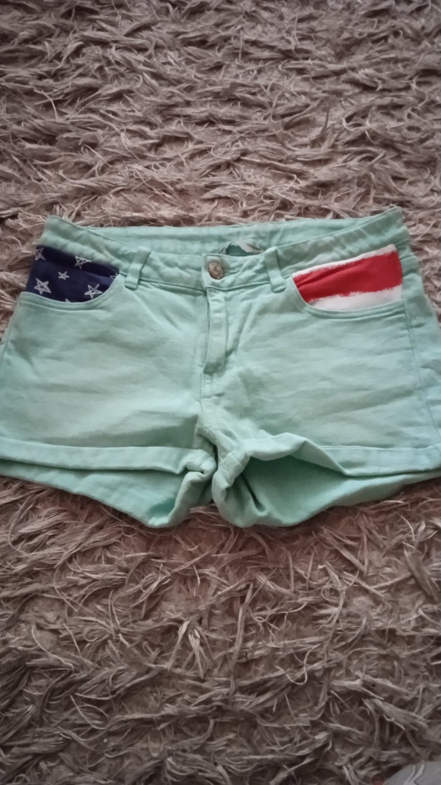 Pekne šortky nosené, zachovalé, dĺžka 27 cm, obvod pásu bez natiahnutia 36 x 2 cm v páse je regulačná gumička