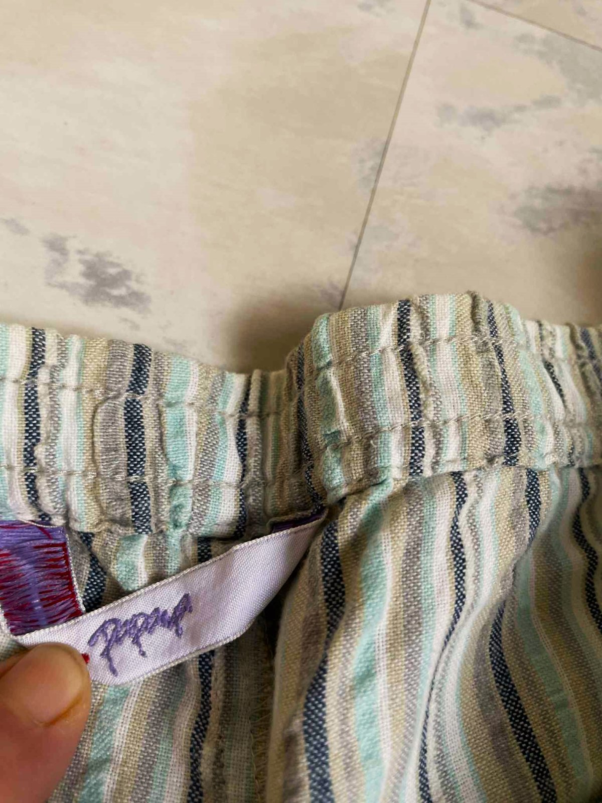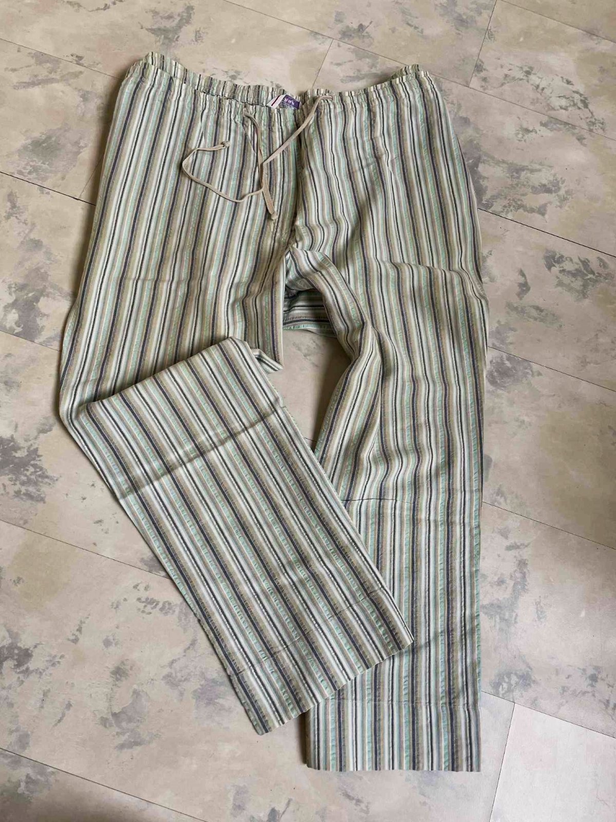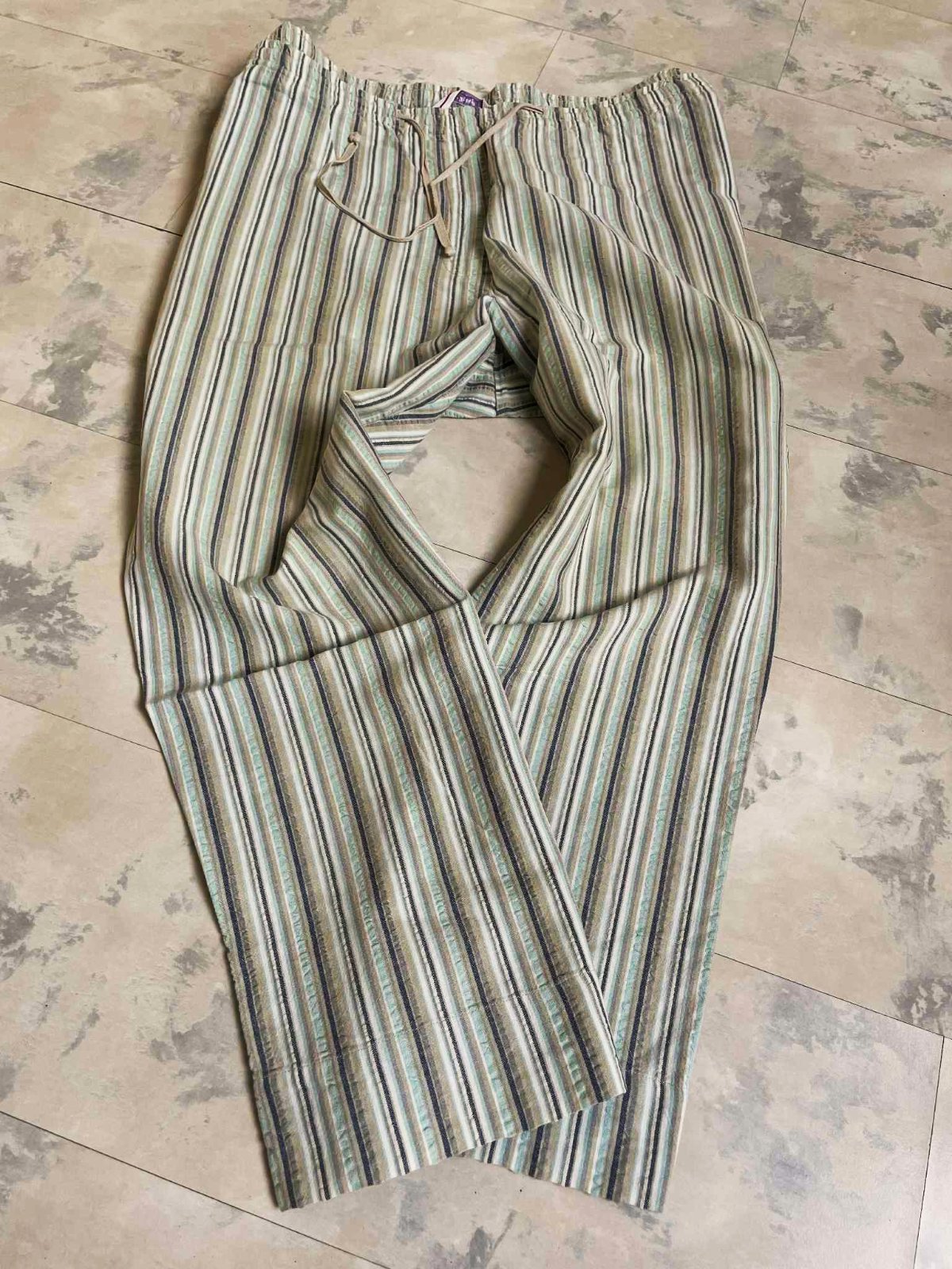 kvalitné,vkusné,bavlnené,udávaná veľkosť 16, 100% bavlna,bočné vrecká,pohodlný vysoký sed,v páse gumička a šnúrka,pásy v pastovej farbe pekne zoštíhľujú,pás max. 55 x 2 cm,boky 65 x 2 cm,dlžka = 89 cm,dlžka vnútorná = 62 cm,stehno = 37/38 cm,noha dole 23 cm nad rozporkami