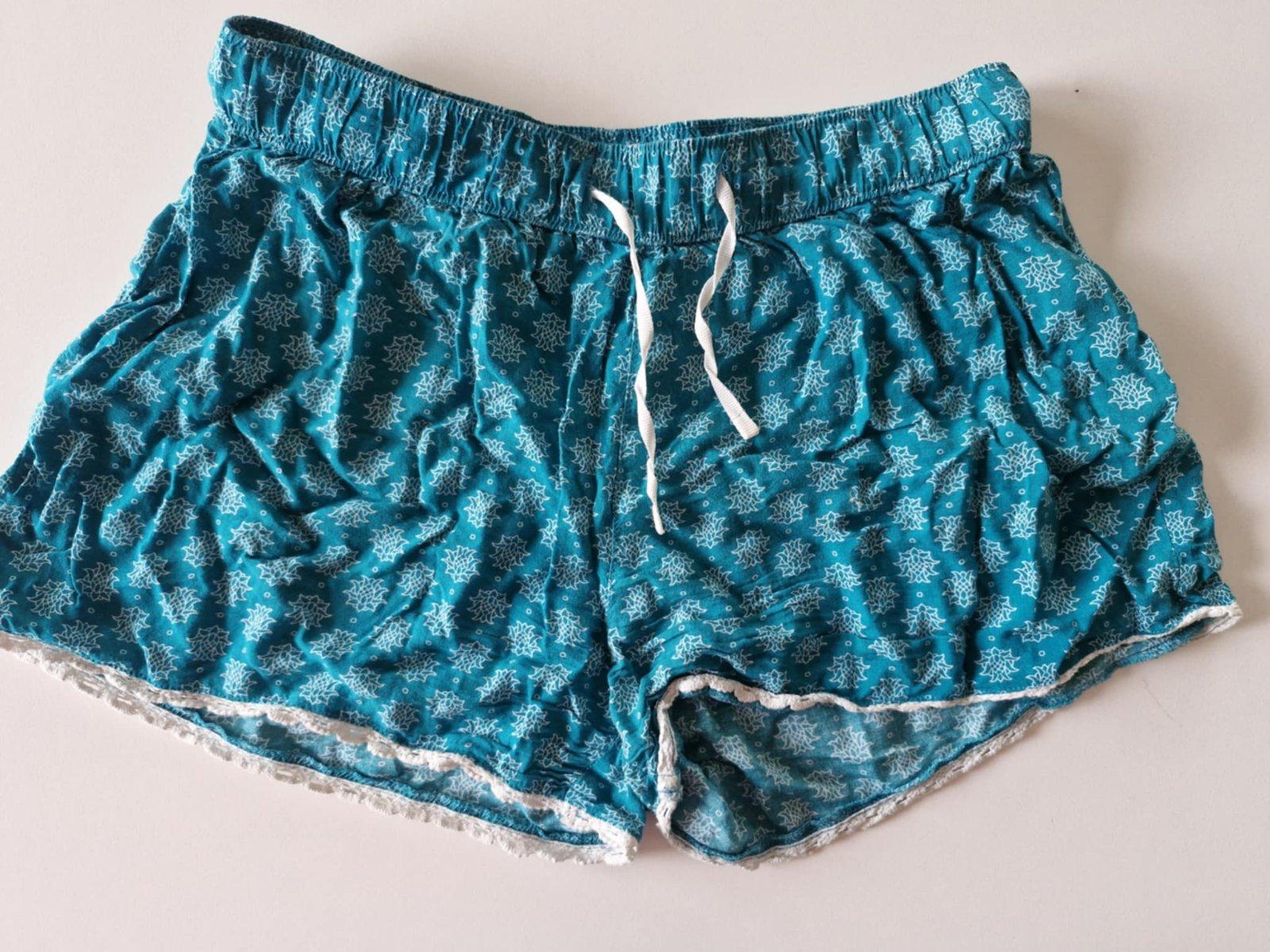 dámske tmavo modré elastické šortky v páse na gumu + šnúrka na zaviazanie, vrecká, dole volániky, príjemný kvalitný materiál, zloženie: 57 % modal, 38 % tencel, 5 % elastan, stav: výborný, málo no...